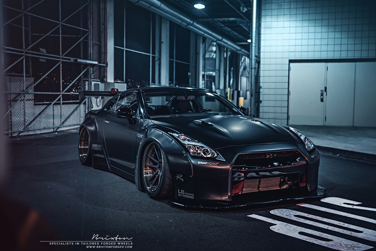 Its sibling from Japan was a widebody Liberty Walk Nissan GT-R. Godzilla was fitted with a full Liberty Walk kit from spoilers to fenders and given a Meisterschaft exhaust system to let the 3.8-liter growl. Brixton Forged installed their M51 Targa Series wheels with a Fine-Texture Matte Black face with 120-grip brushed Smoke Black outer lips and brushed Carbon Red inner barrels and hardware inside the massive fenders. Up front, the all-wheel drive beast wears the forged wheels in an 11.0 x 20 fitment while the rear comes in at a wider 12.5 x 20 setup. To finish off the fitment, a new Airlift digital suspension was installed to alter the ride height instantly.