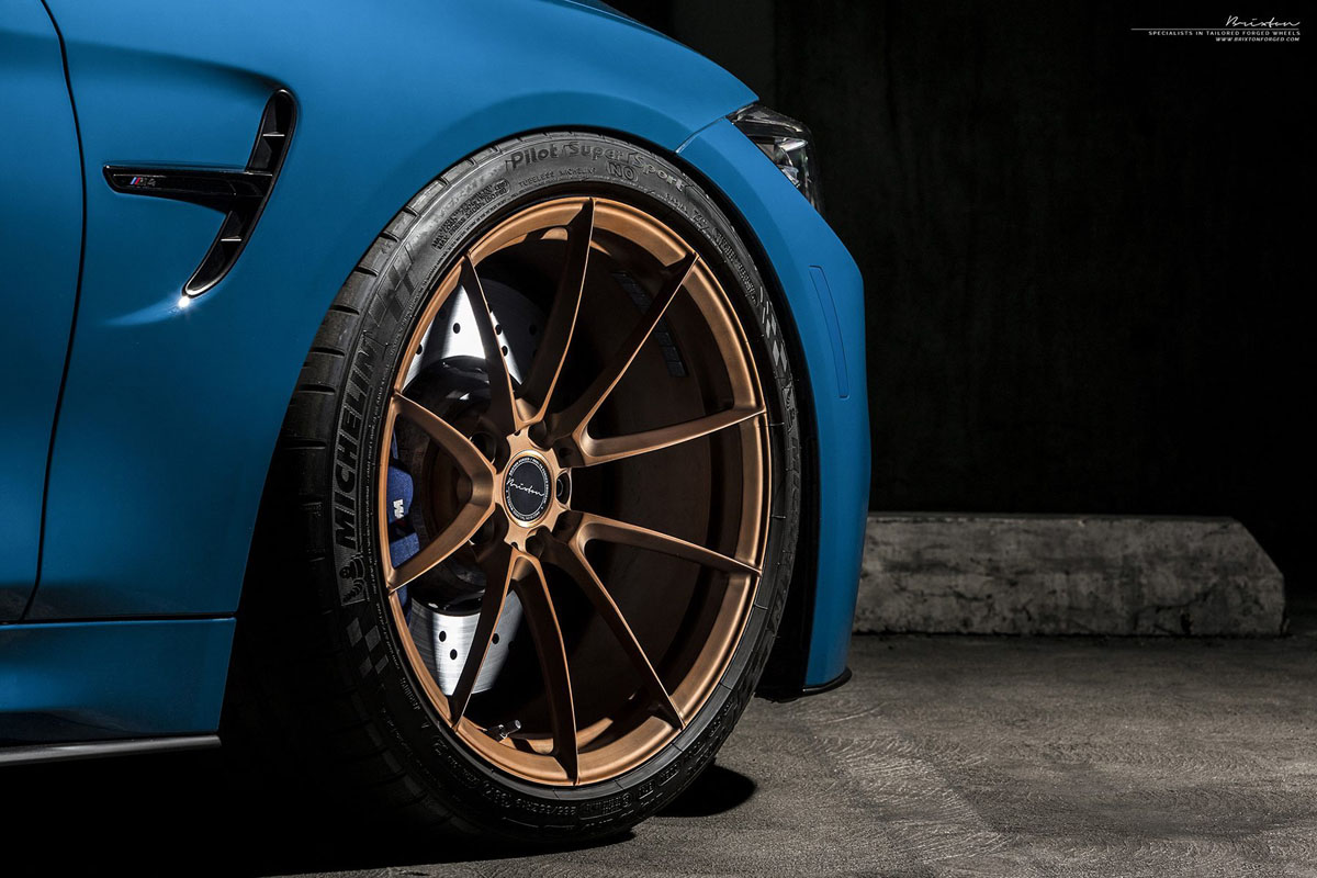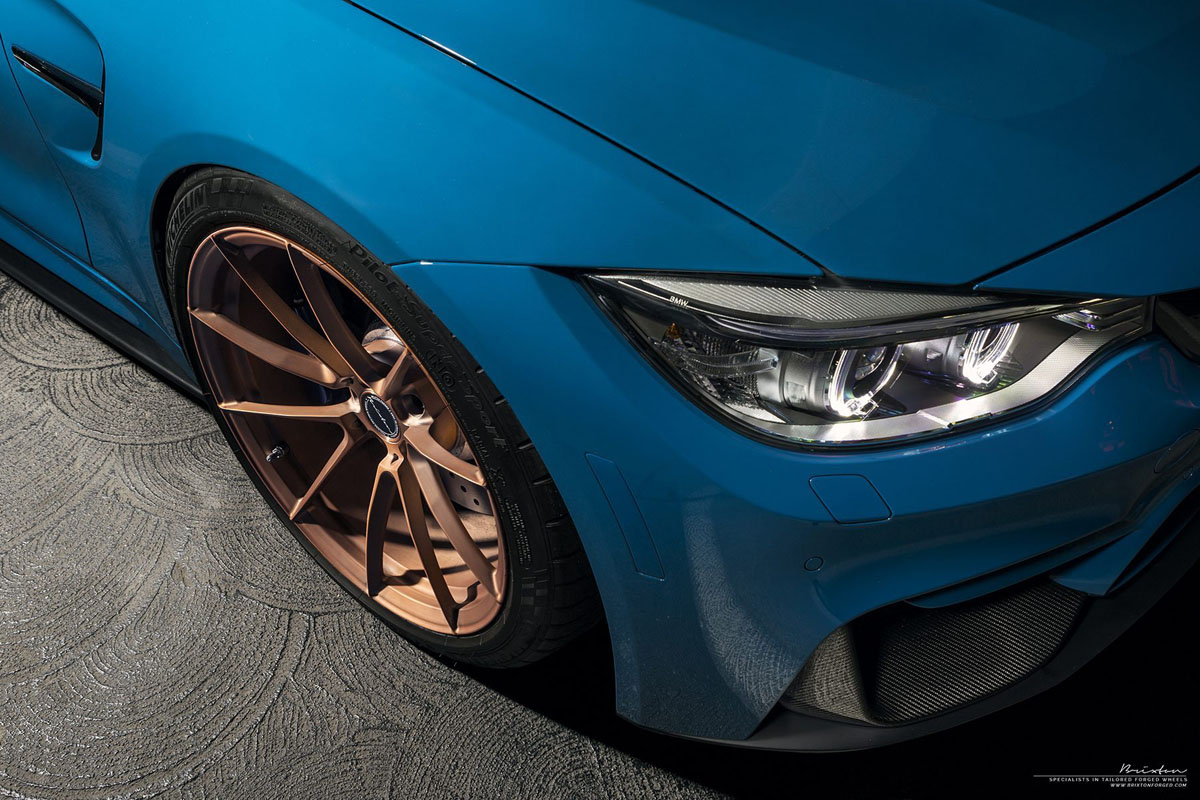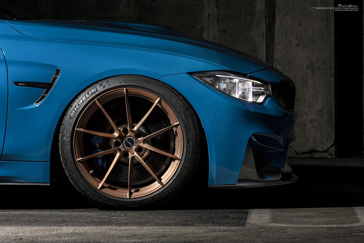 Do you like the contrasting colors of this Laguna Seca Blue BMW M4 with Rose Gold Brixton Forged WR3 Ultrasport+ Wheels?
