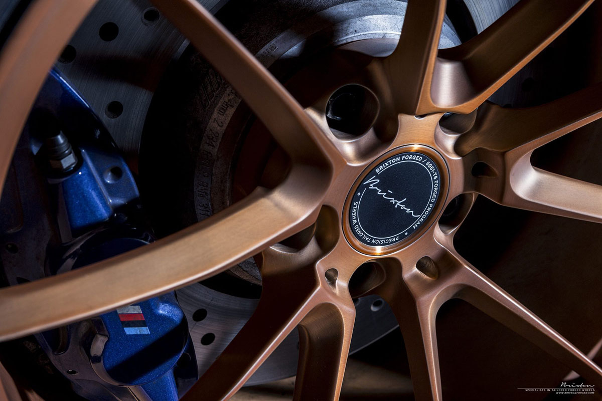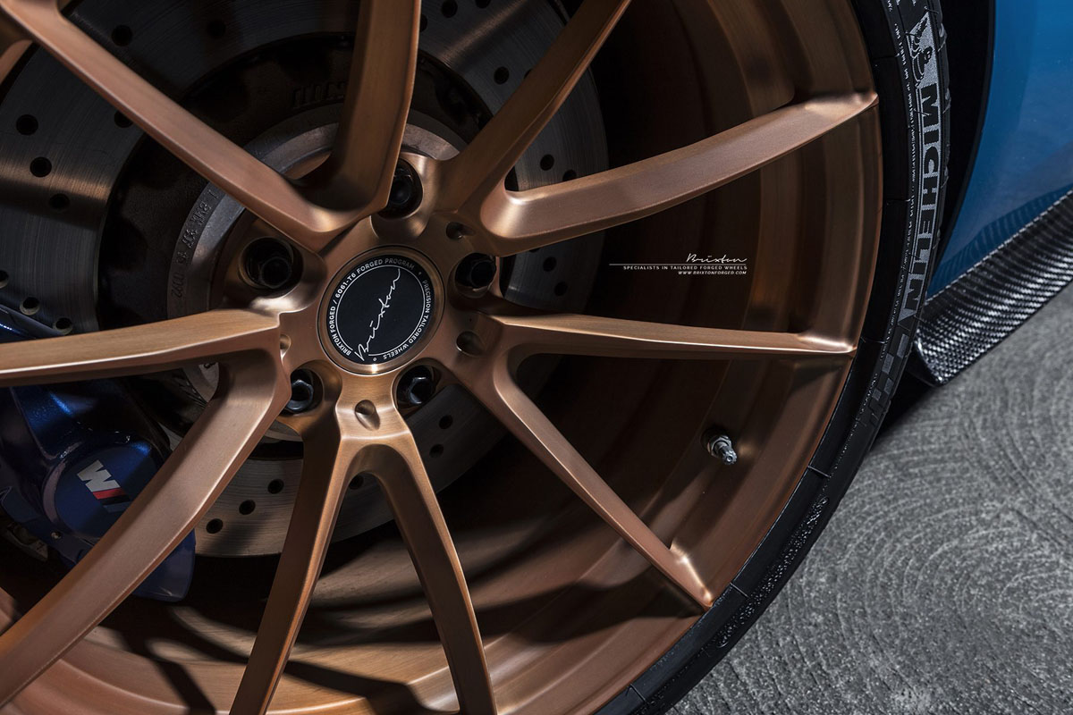 The new Brixton Forged WR3 Ultrasport+ wheels were installed by AutoTalent in a 19 x 10.0 front and 19 x 11.0 rear setup that sits perfectly flush with the fenders. To help stand out from the Laguna Seca Blue body, the Brixton Forged WR3 Ultrasport+ wheels were given a smooth brushed Rose Gold color with a Stain Clear finish.