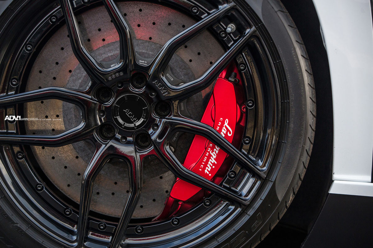 The new carbon fiber aero, however, wasn’t enough to put the Aventador LP 700-4 over the edge. So, a new set of ADV005 M.V2 SL Series wheels were custom-built and installed for an aggressive character. The ADV005 M.V2 SL Series are two-piece forged wheels made from lightweight 6061-T6 aluminum alloy with weight-optimized features for better performance. This Italian wears the ADV005 M.V2 SL Series wheels in a staggered 19 x 9.0 front and 20 x 12.0 rear that emphasizes the wedge-shaped profile of the Aventador. Each wheel also sports a Gloss Black finish and Hidden Hardware option that contrasts the factory Bianco Isis body and complements the carbon fiber aerodynamics.