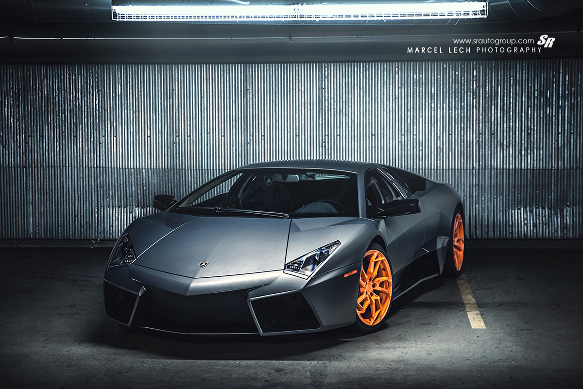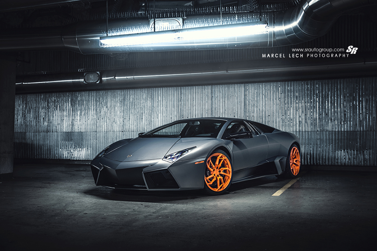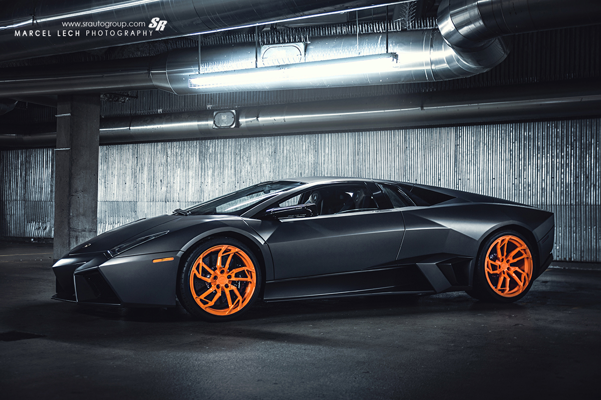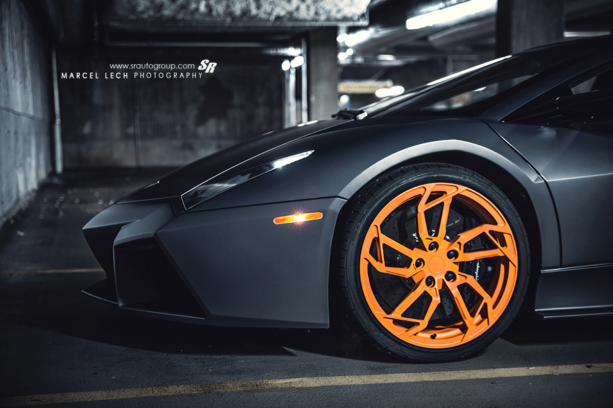 The incredibly rare, one-of-twenty Lamborghini Reventon was equipped with the five, twisting-spoke PUR RS05 forged wheels in a wide 8.5 x 19 front and 13.0 x 20 rear staggered setup. Each wheel wears the same Egoista Orange paint that was featured on the concept in 2013 as well, to contrast the sinister black exterior paint finish.