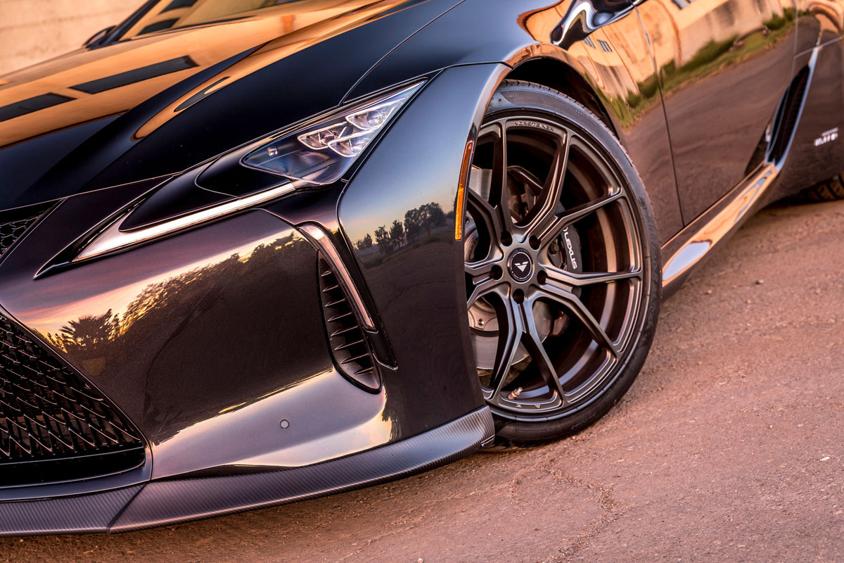 It all starts with Vorsteiner’s V-LC Aero program for the Lexus LC. The kit consists of a new front spoiler extending outwards the full width of the front bumper to cut down on lift and a new decklid spoiler at the rear with two extensions to generate downforce. These two carbon fiber parts aren’t over-the-top but accentuate the LC’s lines and curves to create a more muscular and athletic stance.