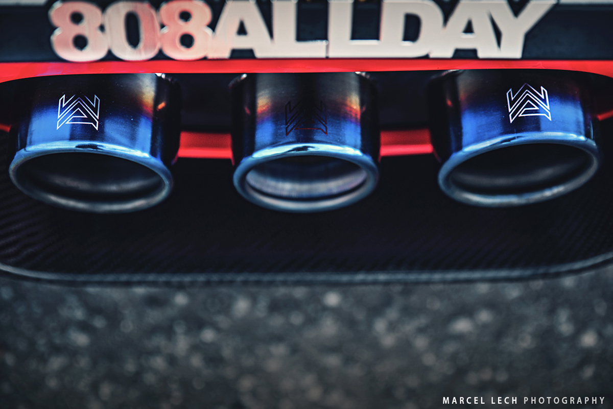 In addition to the new wheel fitment by SR Auto Group, the Liberty Walk Ferrari 458 Italia also sports a new Armytrix valvetronic exhaust system that lets the high-revving V-8 sing a magical Italian symphony of power. Each of the three exhaust tips wear a special blue tint that adds even more contrast to the custom red vehicle wrap.