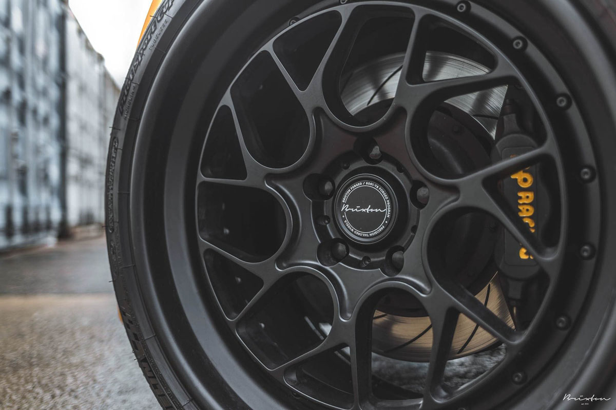 For this fitment, the new Brixton Forged CM7 Circuit+ wheels were installed in a wide 19 x 9.5 front and 19 x 11.5 rear setup. Each wheel wears a menacing Satin Black finish with 50/50 exposed hardware that lends a perfect contrast to the vibrant Yellow exterior.