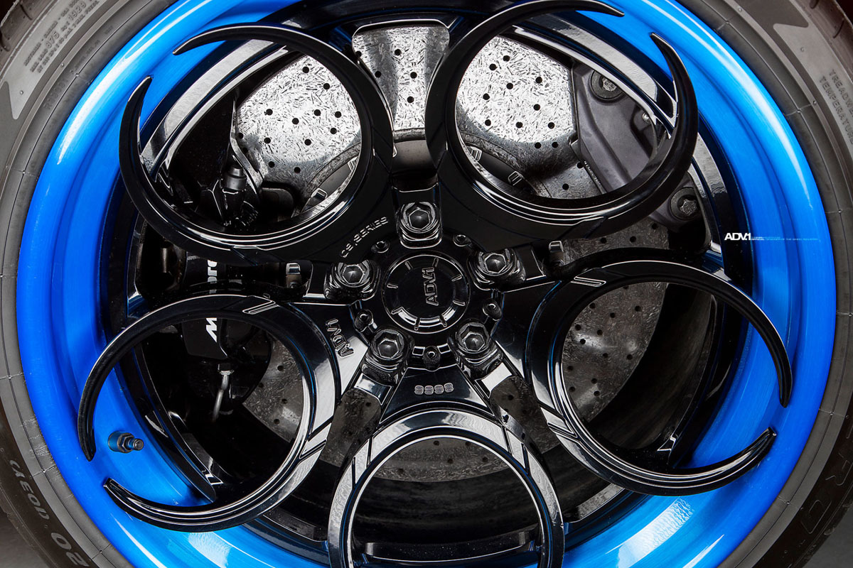 The new ADV05C Track Spec CS Series wheels feature a low overall weight and concave profile with a five circle-spoke design. Here, the new ADV05C Track Spec CS Series wheels were installed in a staggered 19 x 9.0 front and 20 x 11.5 rear setup with the latter boasting a deep concave profile. Each wheel sports a Matte Black disc with Brushed Gloss Blue lip and hidden Titanium hardware option for a clean look.