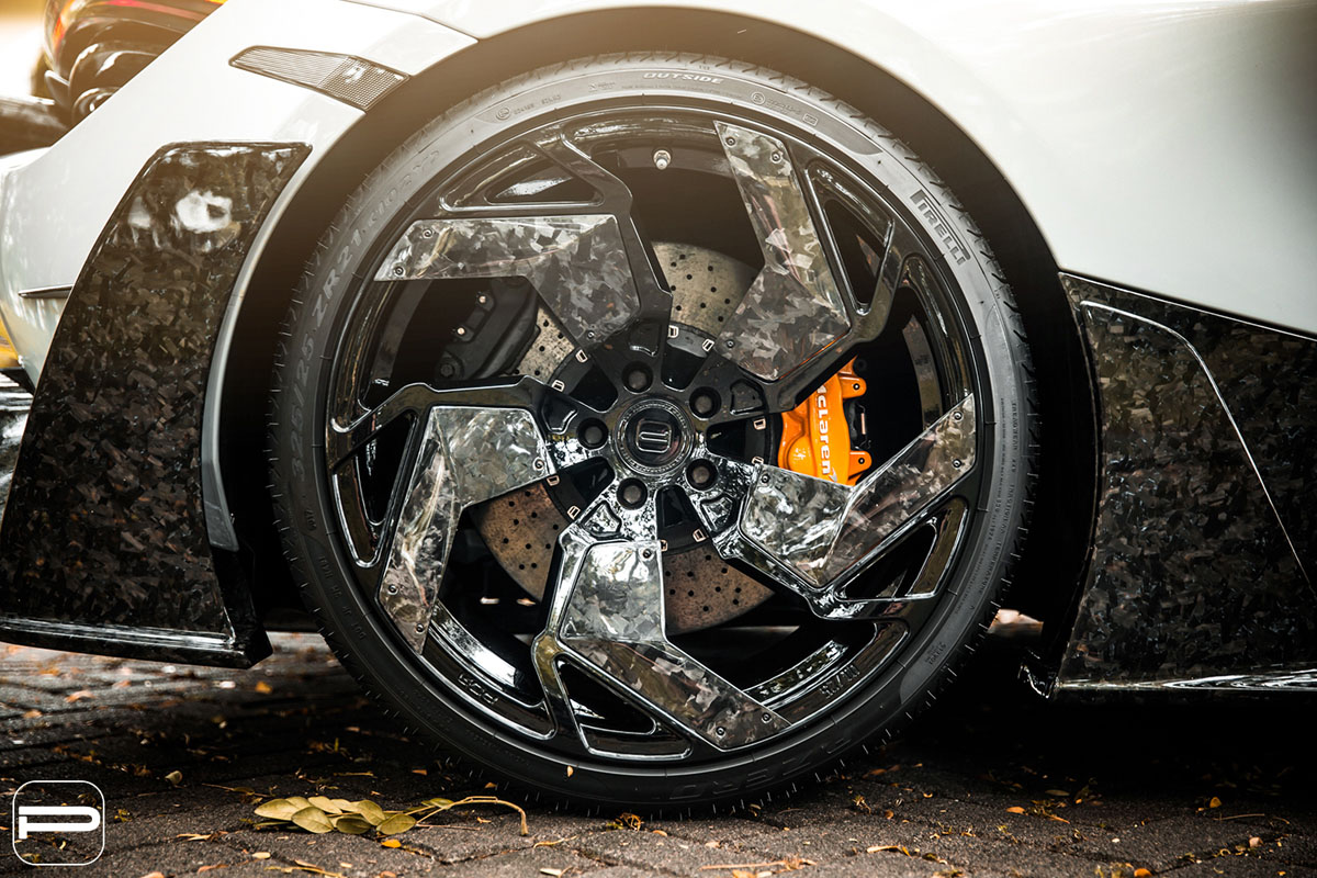 For this fitment, the PUR RS05.V2 wheels were installed in a staggered 20 x 9.0 front and 21 x 12.5 rear setup with the latter boasting a deeper concave profile. Each wheel features a Gloss Black finish with a Forged Carbon Fiber finish that matches that of the Mansory aerodynamic kit for a seamless and tailored look.