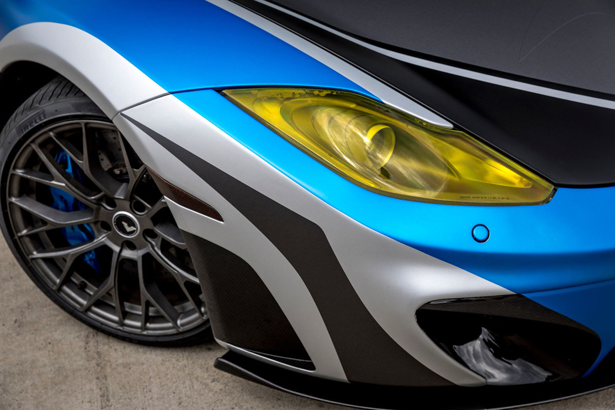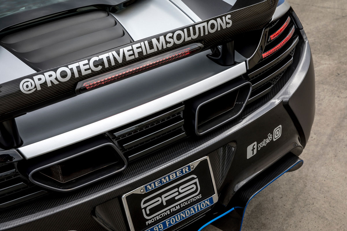 To complete the transformation, Protective Film Solutions installed a customized vinyl wrap across the entire body of the McLaren MP4-12C. A special three-tone grey and blue wrap emphasizes the curves and new aerodynamics to give the super car that extra pop on the road. Even the lights were given a vibrant yellow film cover that provides plenty of contrast to the new wrap.