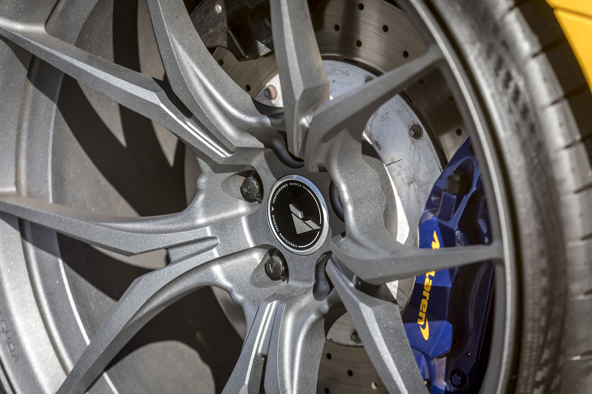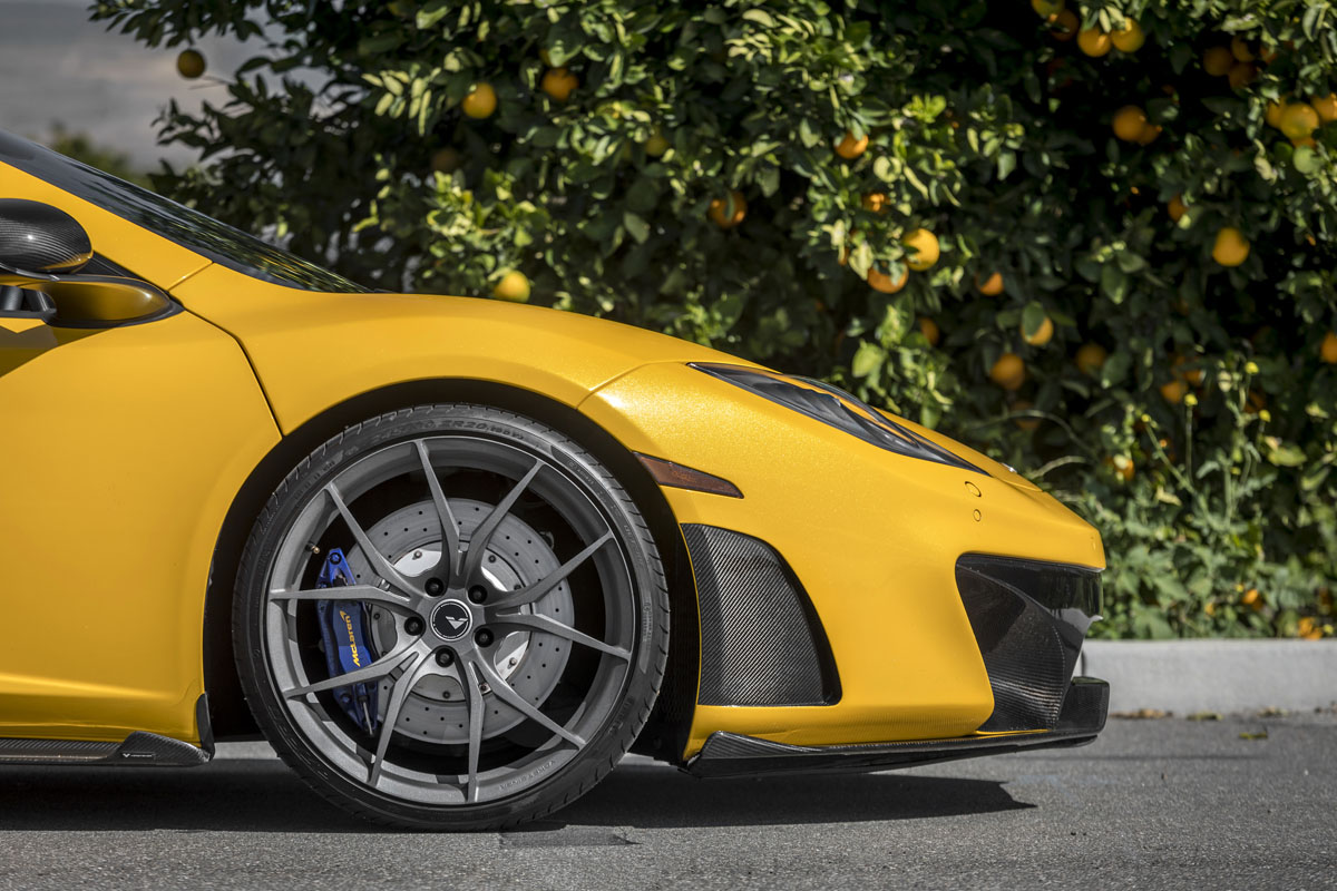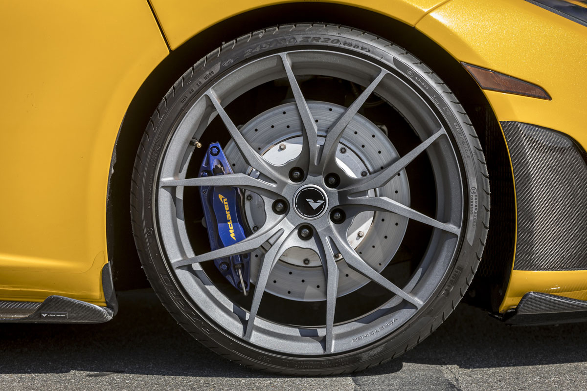 The new carbon fiber aerodynamics are impressive but the Vorsteiner VFN-504 wheels make the McLaren MP4-12C Spider the complete package. The lightweight forged wheels are made from aerospace-grade T-6061 aluminum alloy to keep rotating mass at the wheel hub to a minimum for better overall performance.
