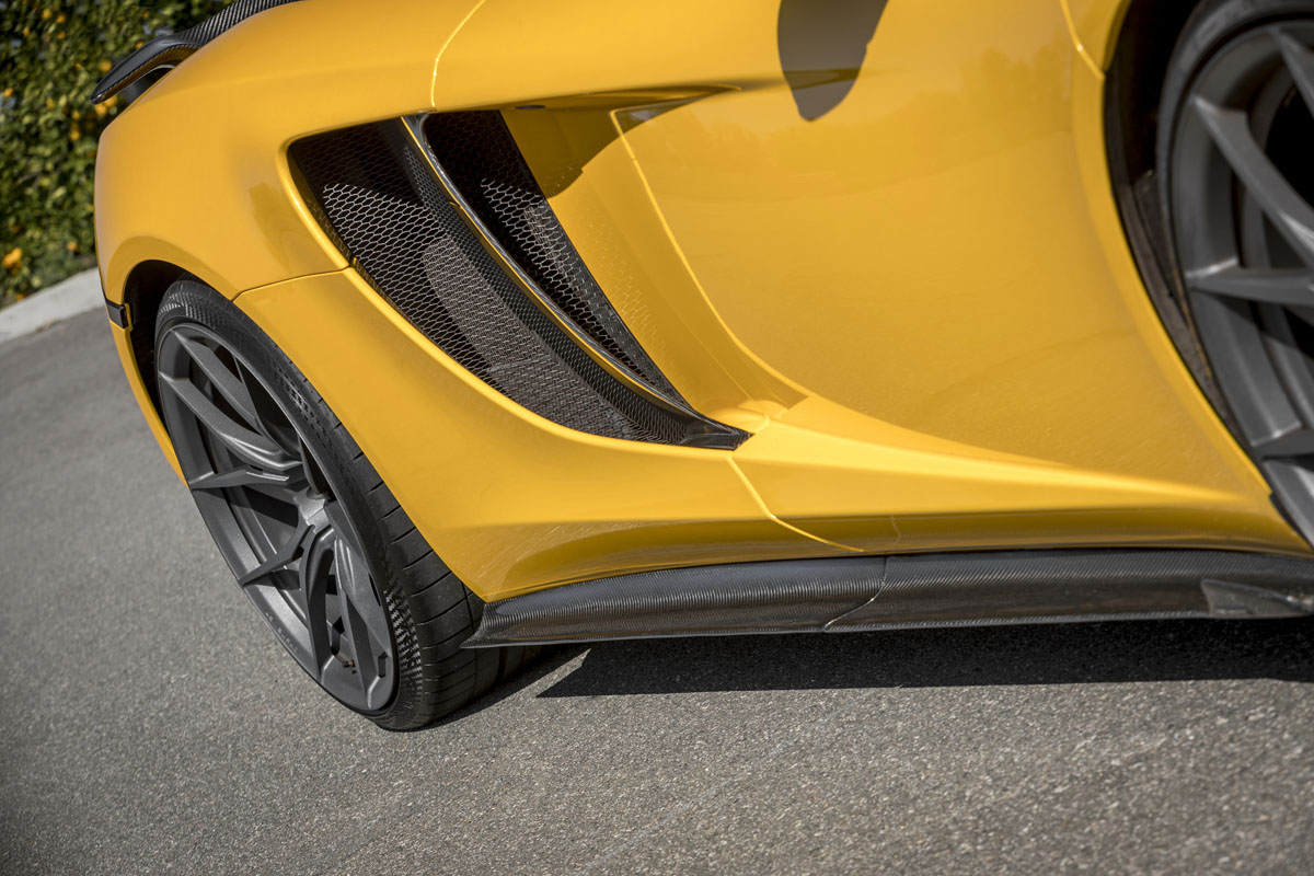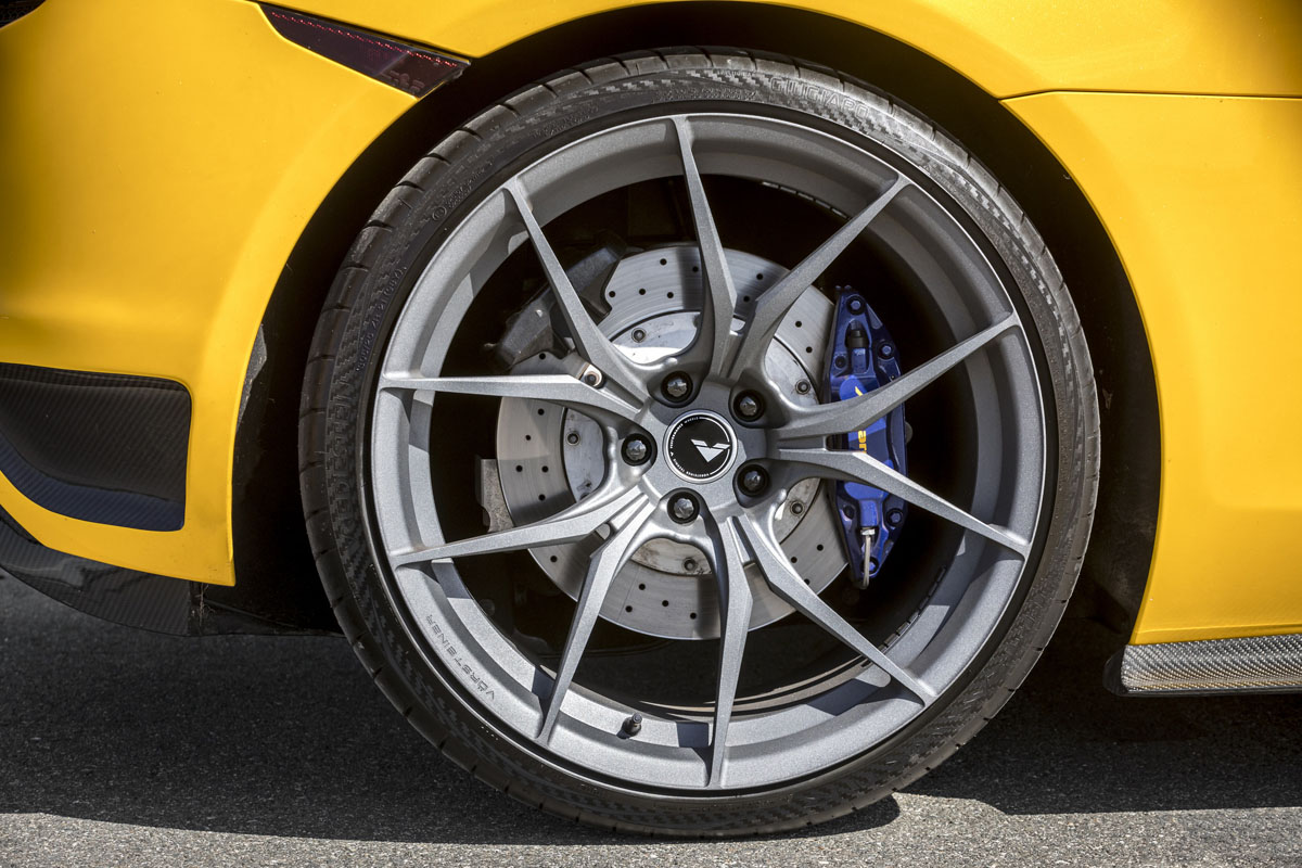 For this application, the Vorsteiner VFN-504 wheels were installed in a staggered 20 x 9.0 front and 21 x 12.0 rear setup to emphasize where the power is hitting the pavement. Each wheel also boasts a Textured Gunmetal finish that adds just the right amount of contrast to the Volcanic Yellow paint and carbon fiber body work.