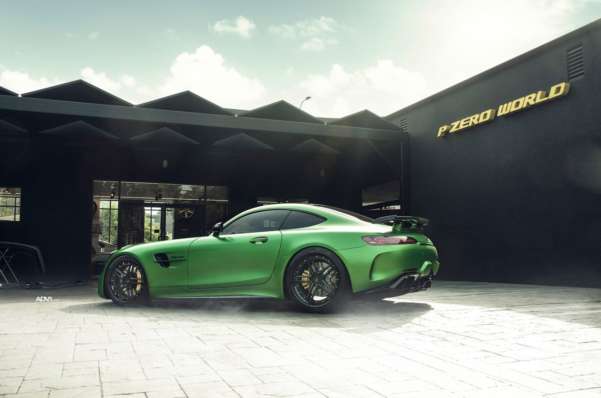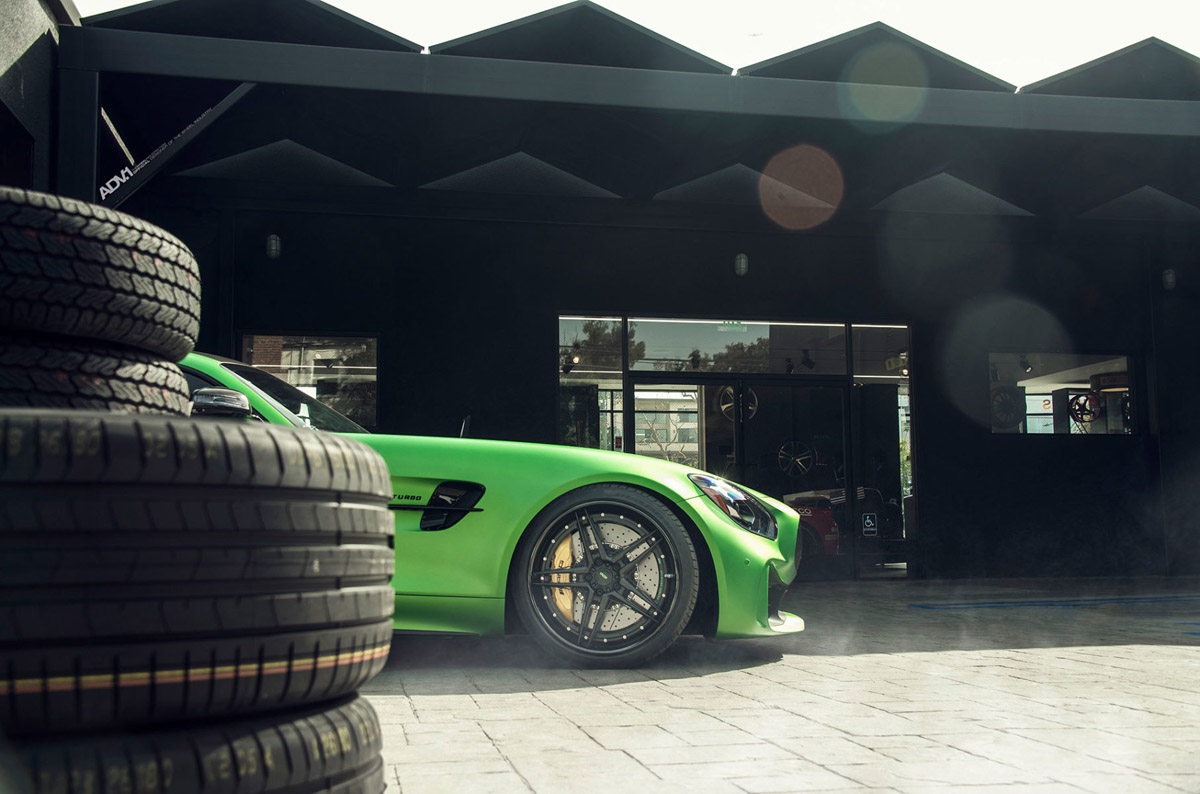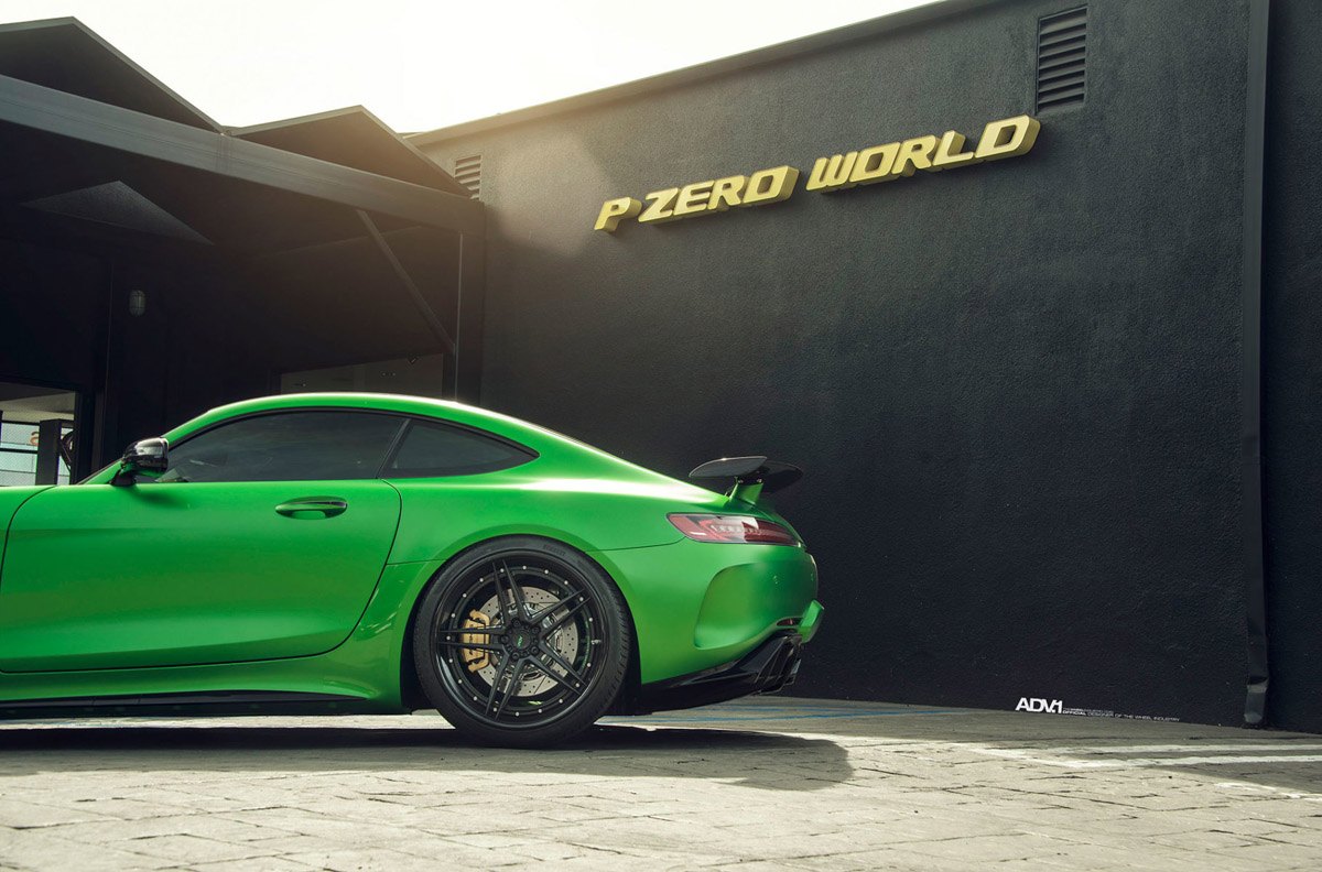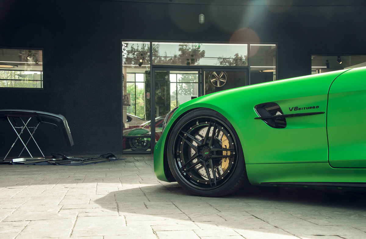 The new ADV05 Track Spec Advanced Series wheels were installed in a staggered 20 x 10.0 front and 21 x 12.0 rear setup, emphasizing the muscular rear-wheel drive layout of the Mercedes-AMG GT R. Each one of the forged wheels also sports a custom Matte Black face and Gloss Black lips with a special AMG Green Hell Magno barrel for the perfect visual fit.