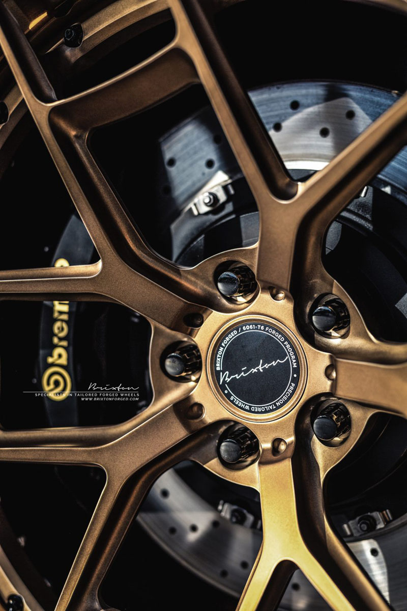 Contrast is the name of the game with the Brixton Forged WR5 Targa Series wheels thanks to their Olympic Bronze color. The face of each wheel features a 120-grit brushed finish covered in a matte clear coat while the lips have a smoother 600-grit finish in a gloss clear coat. Exposed titanium hardware adds even more complexity to the extravagantly styled forged wheels.