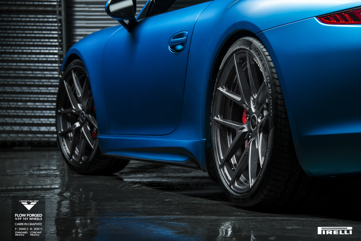 On this Porsche 911 Carrera S (991), the Vorsteiner V-FF 101 Flow Forged wheels were installed with the company’s original Carbon Graphite finish to complement the stunning blue paint finish worn by the sports car. The staggered 8.5 x 20 front and 11.0 x 20 rear setup emphasizes the rear-wheel drive bias and muscle possessed by the 911 by itself. However, this fitment features a standard profile up front and a more aggressive concave profile at the rear that really allude to the rear-wheel drive performance of the 911 Carrera S more than a standard set of staggered wheels ever could.