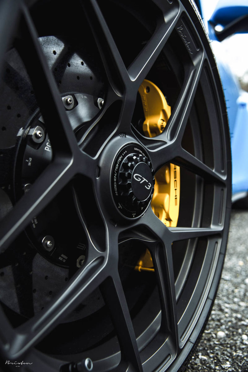 This Mexico Blue 991.2 Porsche 911 GT3 has all that and a bag of chips. The factory center-locking wheels were swapped out for a new set of Brixton Forged PF7 Ultrasport+ wheels. These one-piece, five Y-spoke lightweight forged wheels are built for the track. The focus here is keeping weight to an absolute minimum without sacrificing strength for better acceleration, stopping power, handling, and even fuel economy.