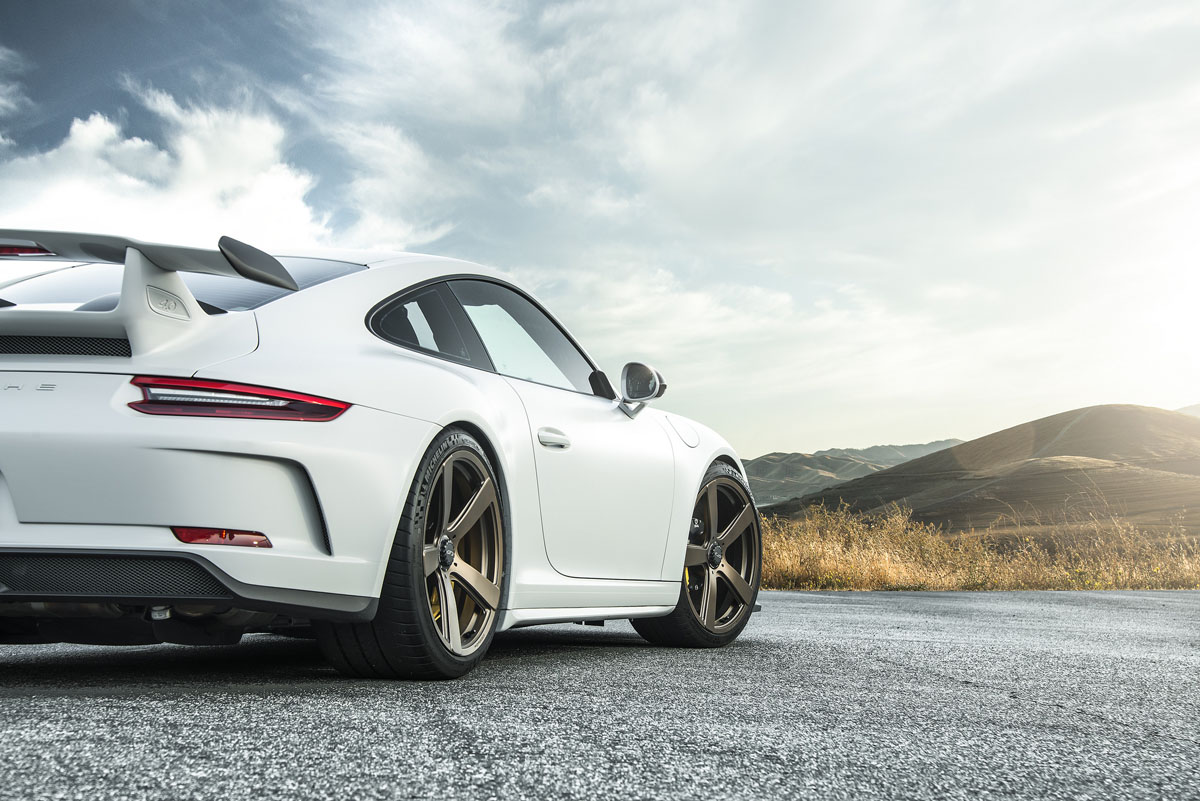 This fitment stars the Vorsteiner V-CS 003 wheels in a smooth Satin Bronze finish that gives just enough contrast to the White body of the Porsche 911 GT3. Up front, the forged wheels measure 20 x 9.0 while the rear comes in with a wider 20 x 12.0 setup for more grip where it counts on the rear-engined super car. Each wheel also sports the weight-saving center-locking feature as well to save an extra couple ounces of rotating mass.