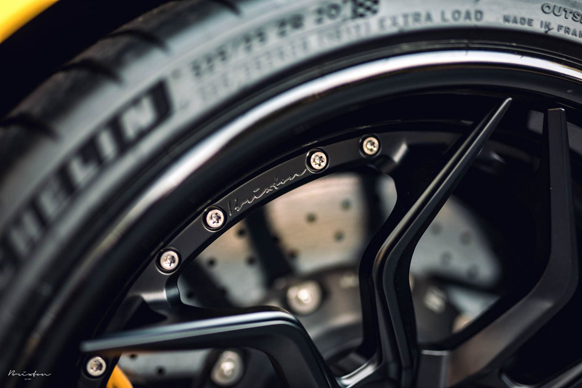 For this fitment, KBH / Import Hookup installed the new Brixton Forged PF9 Targa Series wheels in a staggered 20 x 9.5 front and 20 x 12.5 rear setup with the latter flaunting a deeper concave profile. Each center-locking wheel also sports a Satin / Gloss Firecracker Black finish with raw lightweight titanium hardware to provide contrast to the vibrant Racing Yellow body and match the black aerodynamics.