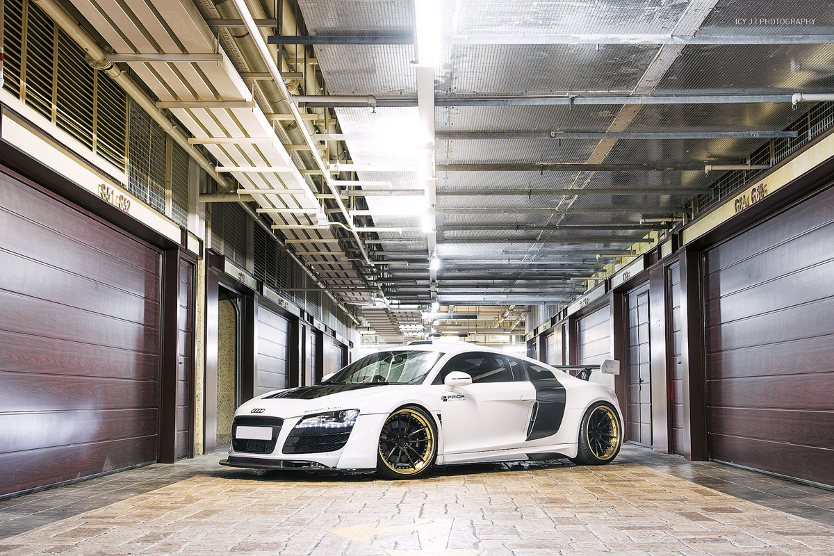 The mid-engined V-10 monster shows off its potent muscles visually thanks to its new Prior Design GT850 widebody kit. The R8 was given the full Prior Design treatment by ReinART Design, and now sports a new front bumper and splitter, extended front and rear fenders with air oulets, side skirts, roof scoop, carbon fiber diffuser, and massive rear wing spoiler. Everything was also finished to match the white and black carbon fiber color scheme of the factory car.