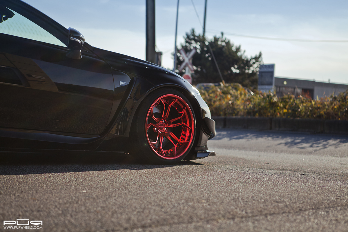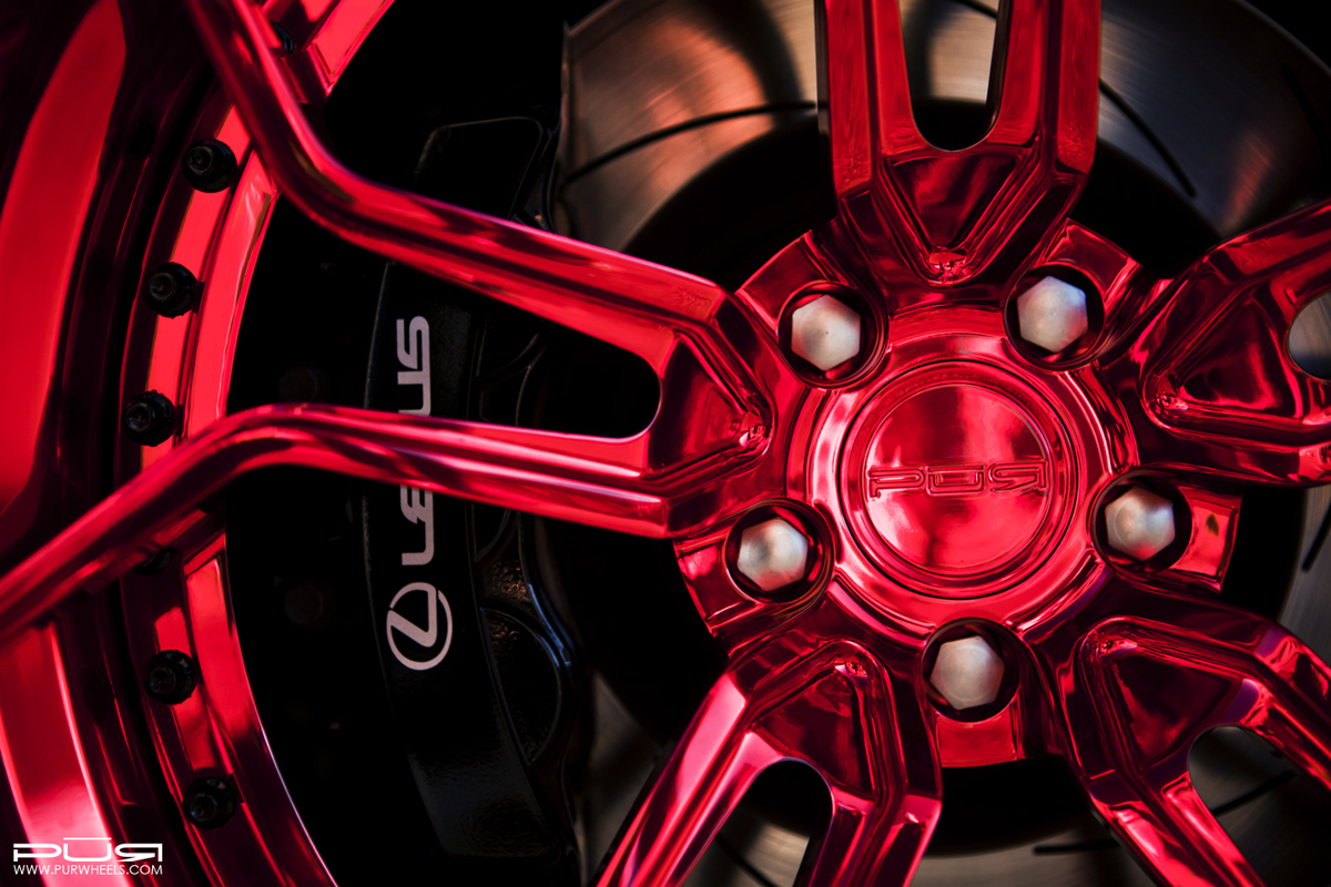 On the wide and wicked Rocket Bunny Lexus RC F, the PUR LX10.V3 forged wheels measure 10.5 x 20 up front and a mighty 12.0 x 20 at the rear with a deeper concave profile. An eye-catching Gloss Davinci Red finish is worn by the face and the step lip while contrasting black hardware around the inner lip provides a touch of contrast.