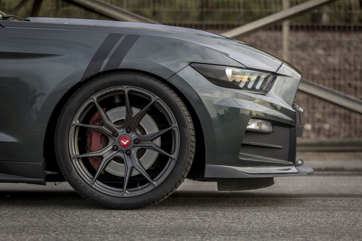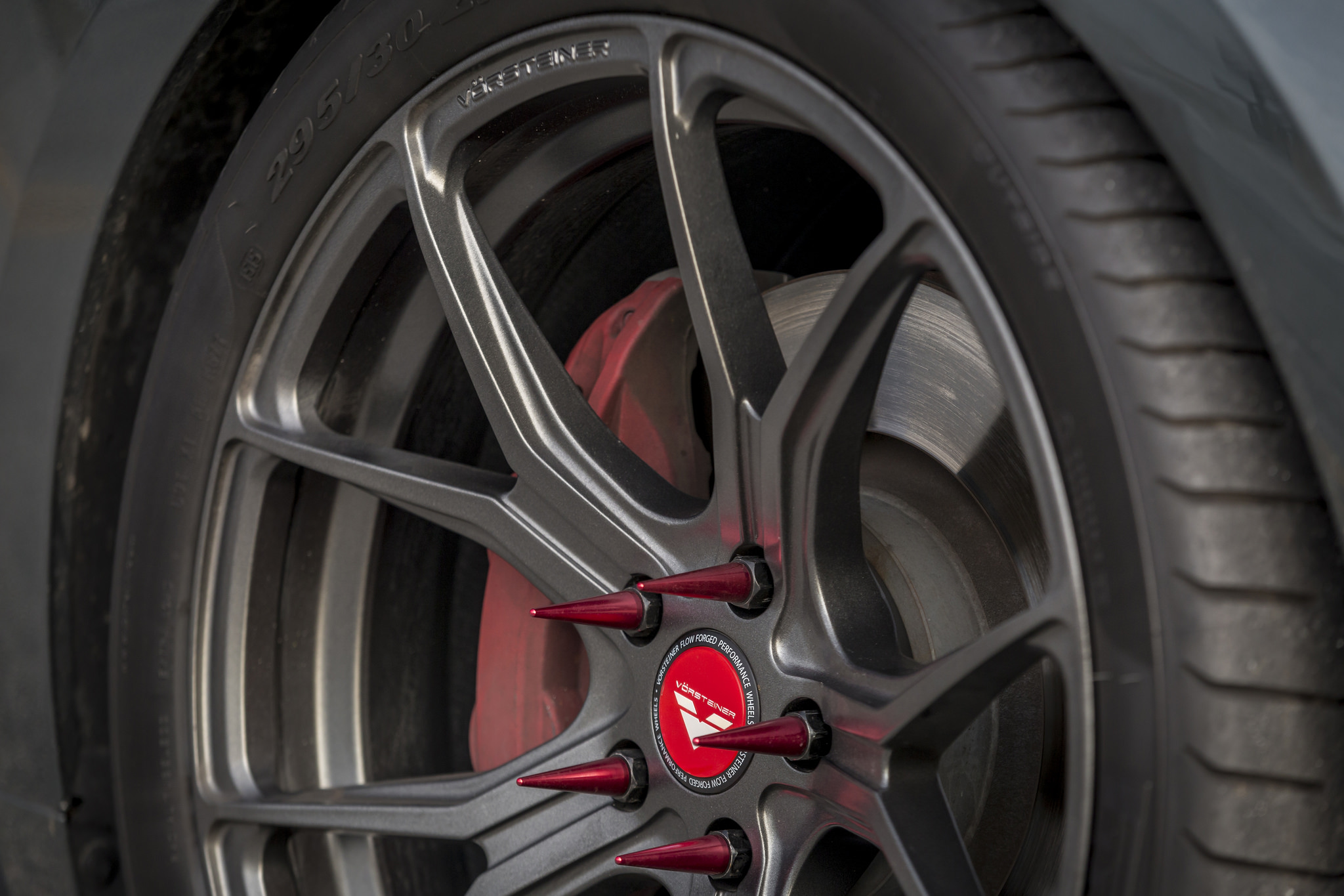 On this Roush Mustang GT, the V-FF 103 wheels were installed in a 20 x 10 ET40 front and 20 x 11 ET50 rear setup with corresponding 295/30/20 and 315/35/20 tires. Each wheel also features a smooth Carbon Graphite finish with metallic red spike hardware over each of the bolts for a more sinister, customized look.