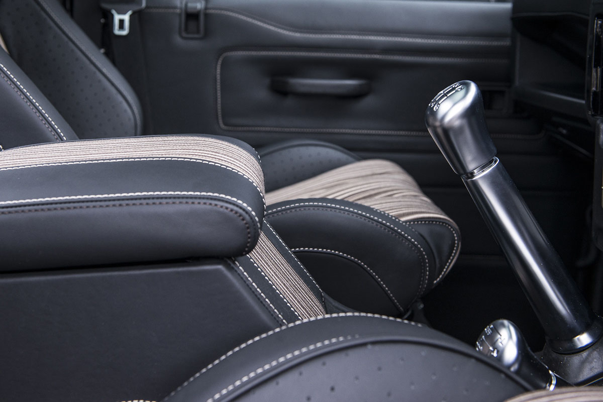 Going through whatever kind of terrain the driver desires are new 1945 Retro alloy wheels. These 18 x 20.0 Matte Black finished wheels feature a Red stripe and classic design that pays homage to vintage Land Rover models. These are also shod in meaty 275/55/20 Cooper LTZ tires supplied by Kahn Design technology partner, Cooper Tire. New mud flaps at the rear keep things neat and seamlessly integrate the new twin cross-hair stainless steel exhaust system.