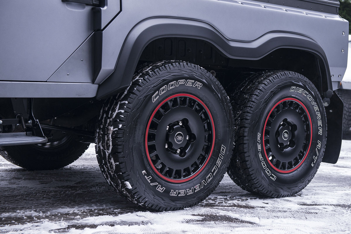 The new Flying Huntsman 6X6 Civilian Carrier is about 880 mm longer than the Defender of which it is based and features a whole range of new mechanical and body upgrades. An additional axle was installed to push the total number of wheels to six – all of which can be driven through pneumatic actuation and a custom, switchable differential with hi-lo ratio drive. A heavy-duty chassis and upgrade braking system give the SUV even more muscle for getting out of sticky situations.