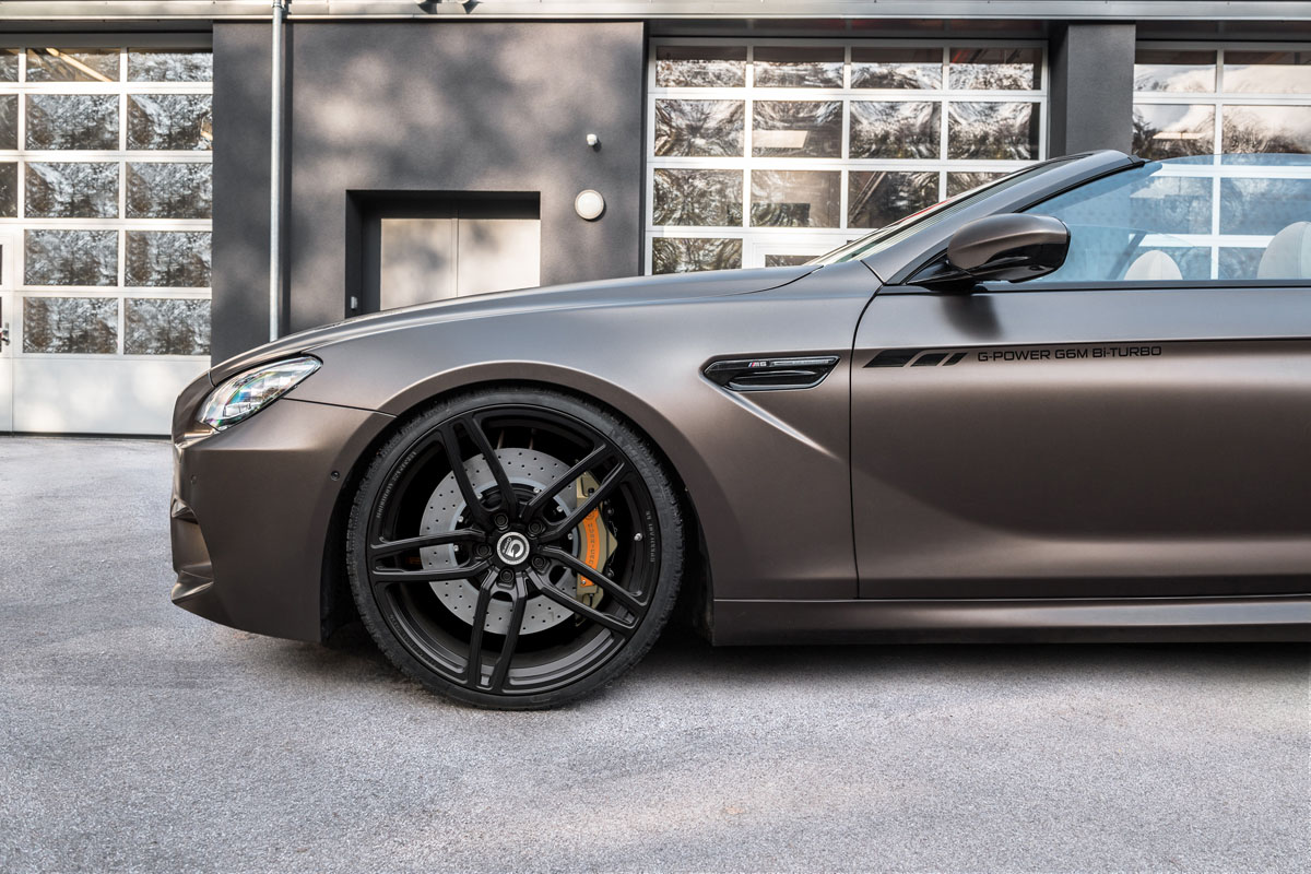 Helping to achieve those kinds of crazy performance numbers on the BMW M6 Convertible are new G-Power wheels and coilovers. New G-Power Hurricane RR forged alloy wheels cut weight without affecting strength and durability despite their large 21 x 9.0 front and 21 x 10.5 rear size. High-performance 255/30/21 and 295/25/21 tires help generate more grip than the factory wheel and tire setup, especially with the new G-Power GM6-RS suspension. The new height-adjustable coilovers reduce ride height and can be independently adjusted for bounce and rebound control.