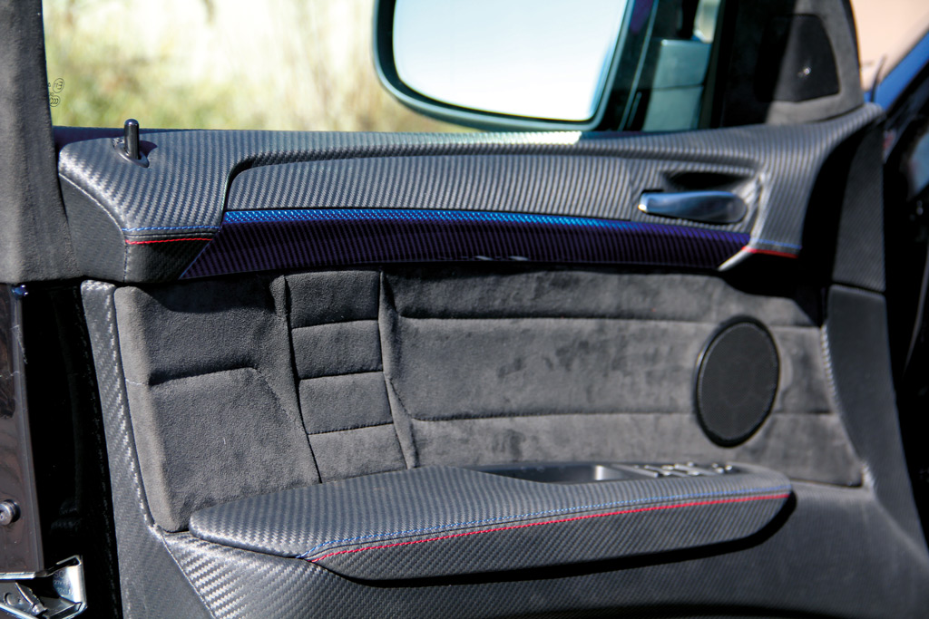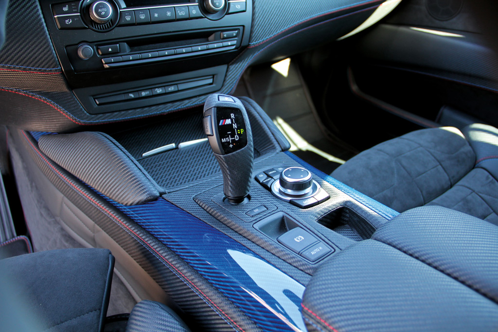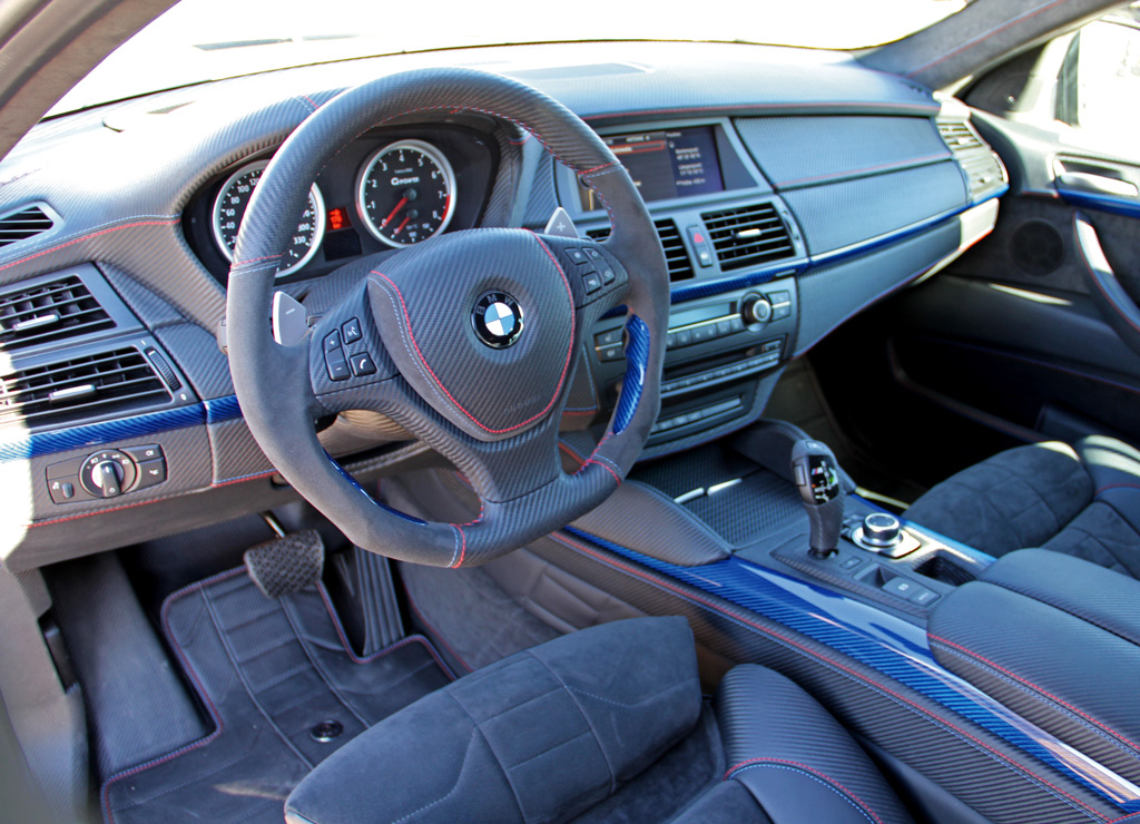 Inside, the sporty nature of the G-Power BMW X6 M Typhoon mixes sport with luxury. Blue tinted carbon fiber, grey alcantara, and other high-tech materials grace the entire cabin. Other new accessories such as an ergonomically-shaped sports steering wheel, G-Power gauge cluster, and rollout iPads integrated into the front seat backrests add a special touch of technology and speed.