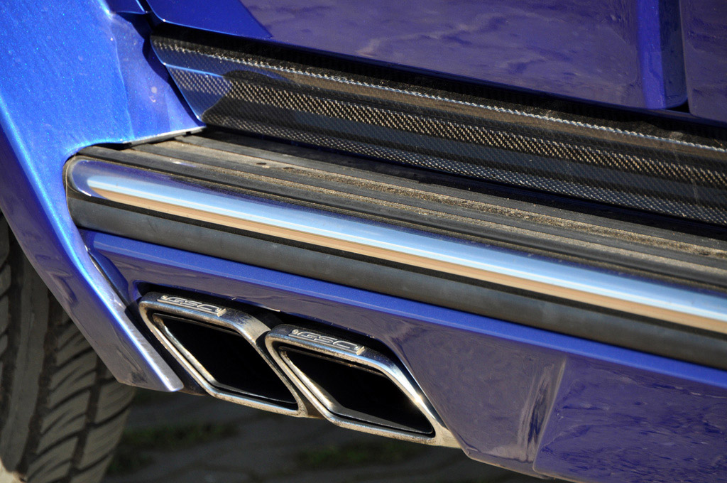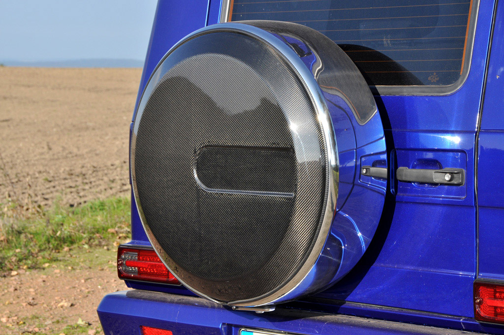 Each side of the G-Class are newly extended fenders and carbon side mirrors that emphasize power and brute force. German Special Customs connects them with a pair of side skirts that integrate dual trapezoidal stainless steel side exhausts prior to the rear wheel arches. At the rear, the boxy shape is improved upon with a new bumper with diffuser-look and air vents that lower the ride height visually. A large carbon fiber spare wheel cover replaces the factory unit for some sportier looks.