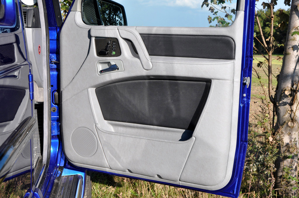Inside, German Special Customs can give the off-road box an even more refined interior for those long treks across the desert or across the asphalt to the shopping mall. All of the seats can be trimmed in a custom array of leather and/or alcantara with unique stitching patters along with the roof and pillars. Carbon fiber trim pieces add a touch of sportiness to the cabin while front and rear infotainment systems add to the overall custom-tailored touch.