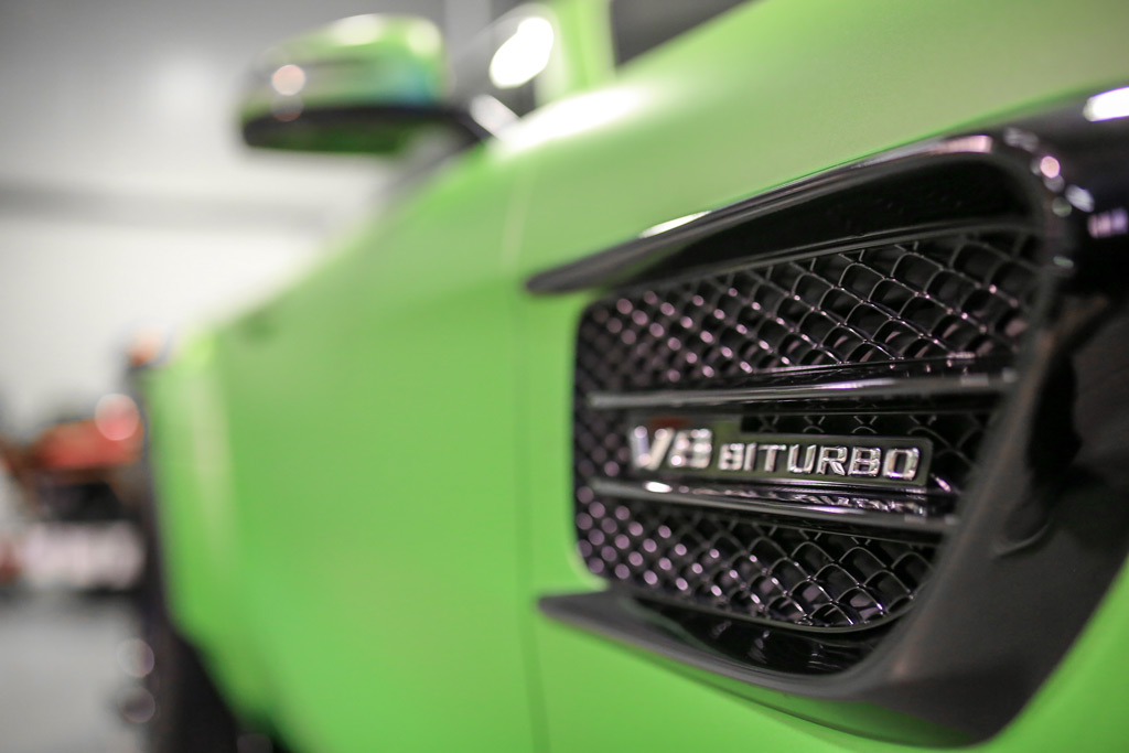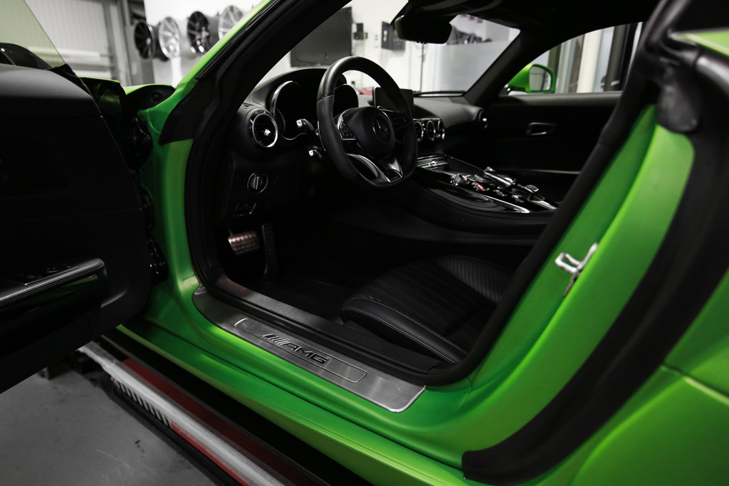 Besides the muscular Prior Design body work, the Mercedes-AMG GT S gets it’s “Hulk Edition” name from the vibrant Lemongrass Metallic vinyl wrap. The matte green wrap is a more vibrant version of the paint found on the AMG GT R and incorporates black badging to match the new gloss black aerodynamics.