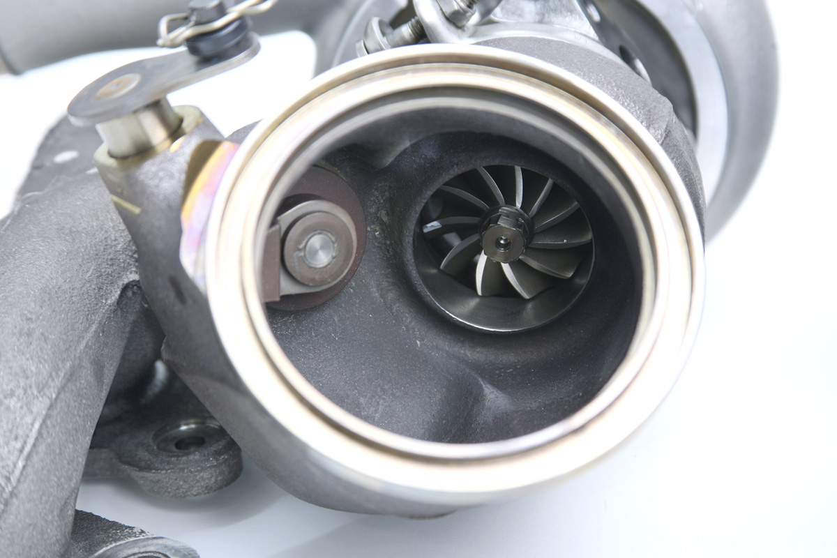 The TwinPower 3.0-liter inline-six engine is outfitted with a bespoke lightweight titanium exhaust system with 90 mm carbon tailpipes, larger downpipes, and no catalytic converters for reduced backpressure. Both of the turbochargers also got modified with new flow-optimized CNC-machined turbine and compressor housings, along with aerodynamic turbine housings.