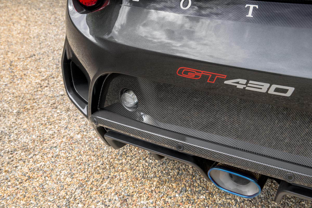 The new Lotus Evora GT430 has an additional 19.8 lbs. of components but is 57 lbs. lighter with an overall dry weight of 2,773.4 lbs., making it the lightest road-legal Evora to-date. This comes thanks to new carbon fiber front and rear bumpers with exposed weave sections, one-piece carbon tailgate with louvered section, and more.