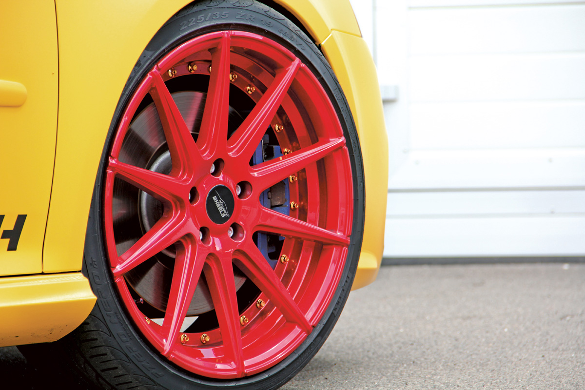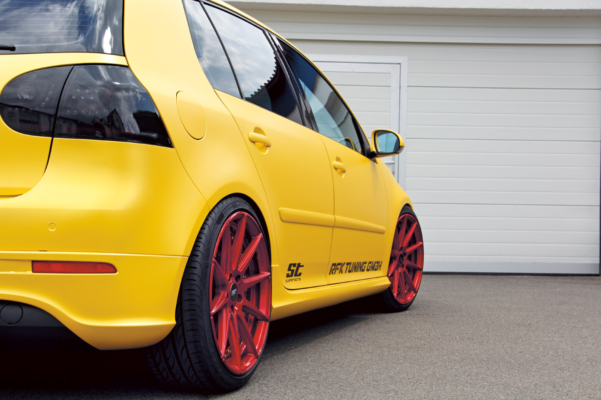 Grabbing attention visually is the new Matte Chrome Yellow wrap that covers the entire body of the R32. RFK Tuning then installed a set of their in-house E 1 Concave split-rim wheels with special decorative gold screws that make the one-piece wheel look like a multi-piece wheel. The ten-spoke wheels measure 8.5 x 19 and have a candy red finish to contrast the yellow wrap. The front and rear wheels were manufactured with ET45 and ET35 offsets, respectively, ensuring that they have no problem clearing the large R32 brakes. Completing the fitment is a set of 225/35 ZR19 Pirelli P Zero Nero tires for even more grip.