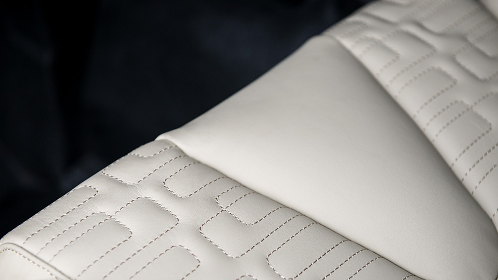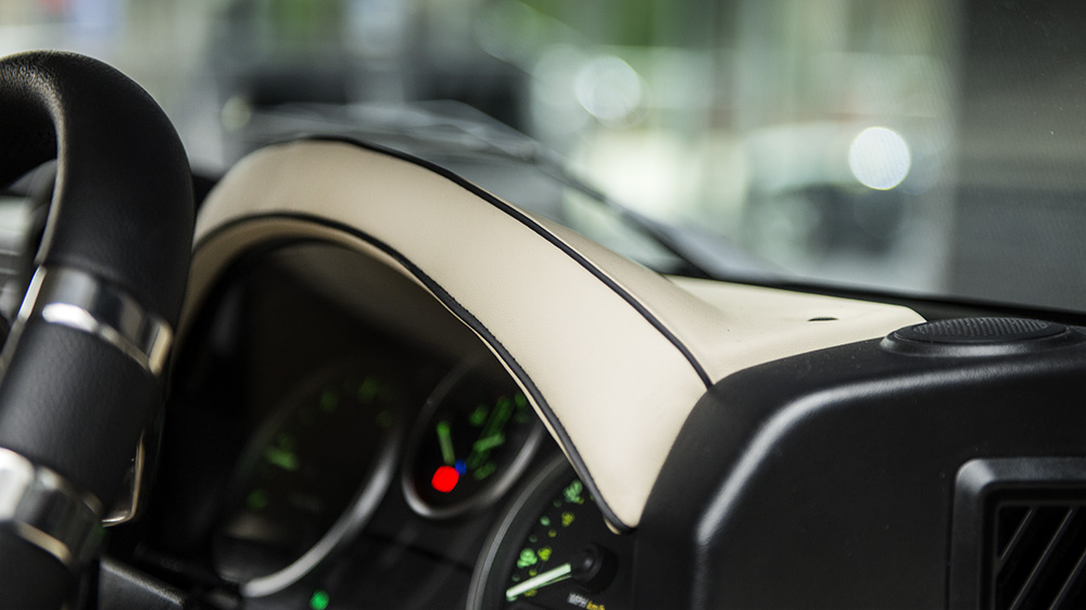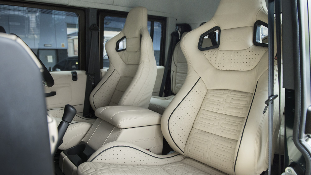 The exterior and hardware of the Land Rover Defender XS 110 Double Cab Pick Up Chelsea Wide Track may be brawny and purposeful, but the interior is designed for off-road opulence. A soft Portland quilted leather covers the new front Sports GTB seats and matches the leather used on the center glove box. The instrument binnacle and door cards were also trimmed in leather, albeit with a contrasting black color. The Chelsea Truck Company also added a number of accessories such as a Satin Silver Kahn billet steering wheel, vented pedals in machined aluminum, and a dashboard-mounted Churchill time clock.
