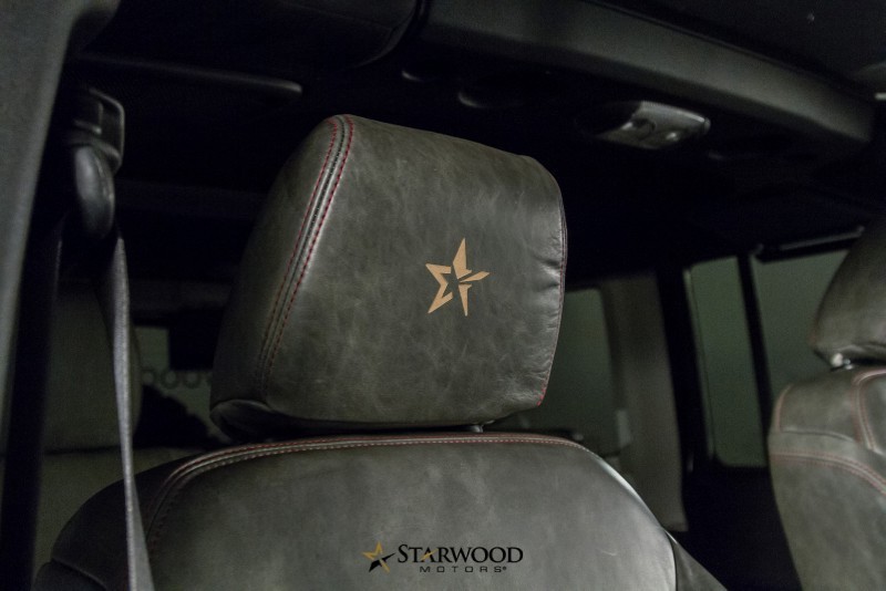 Underneath the Rugged Ride sun shade cover is a comfortable interior wearing a saddle-finished Nappa Schist leather with red stitching. Both of the heated front seats proudly wear the custom leather upholstery and feature Starwood Motors logos embroidered in each head rest.