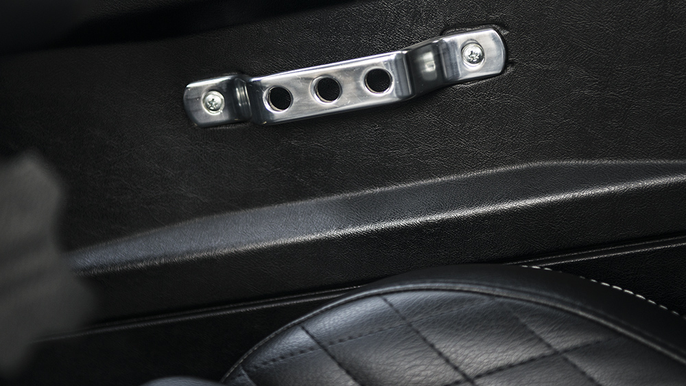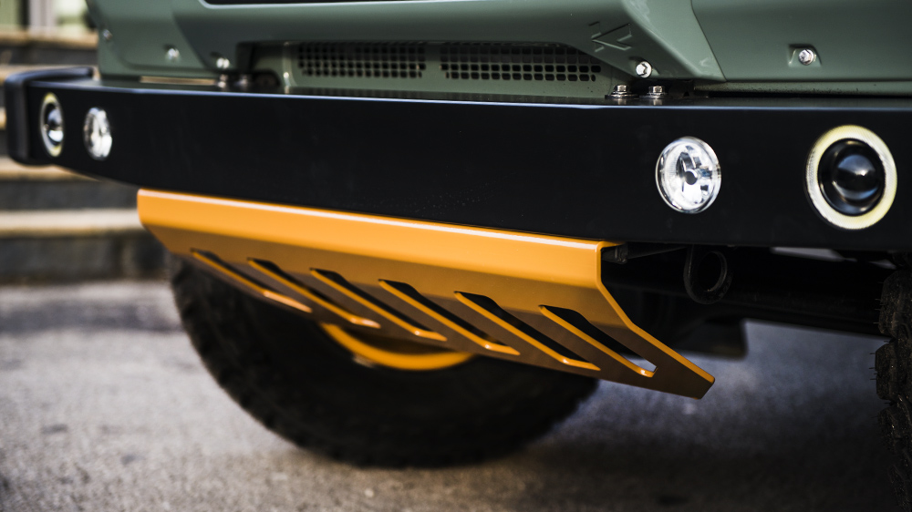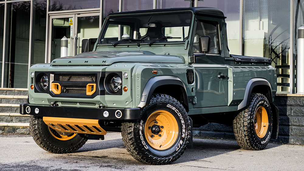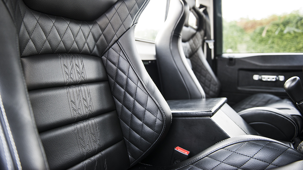 Inside, the purposeful design of the Land Rover Defender gets a more luxurious touch. Both the front seats were swapped out for more supportive Sports GTB seats trimmed in quilted and perforated leather. A full leather instrument binnacle and door card set comes complete with Alcantara trimming for that extra touch of comfort, while hard-wearing floor mats handle any kind of mess from off-roading. A new Kahn billet steering wheel, gauges, and vented foot pedals in machined aluminum all lend to a more engaging driving experience. The final touch is a new Churchill time clock integrated into the dashboard.