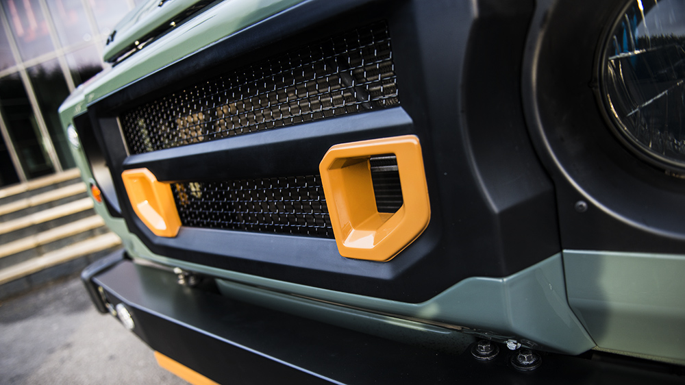 The classic boxy styling of the Land Rover Defender models is emphasized with a new set of extended fenders with exposed bolt apertures. The front fascia is transformed with a new bumper replacement with integrated daytime running lights and shadow chrome headlights to blaze the trail ahead. A new X-Lander front grille was color matched to the lower bumper guard and lends to a toughened look. A stainless steel hood and fender vent mesh maintain the off-road purpose.