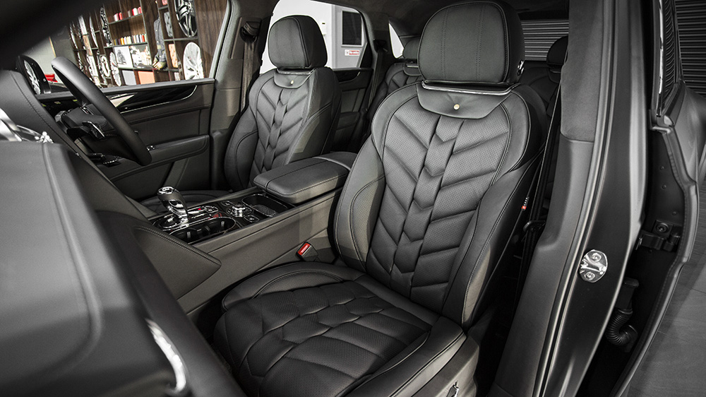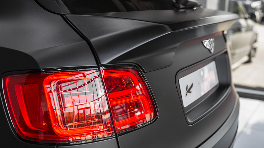The first Bentley Bentayga to be redesigned by Afzal Kahn wears a menacing Volcanic Rock Satin exterior. The more aggressive character is shown in the new Kahn carbon front bumper spoiler and Kahn carbon rear spoiler boot wing that emphasize the 600-horsepower, twin-turbocharged W-12 engine under the hood.