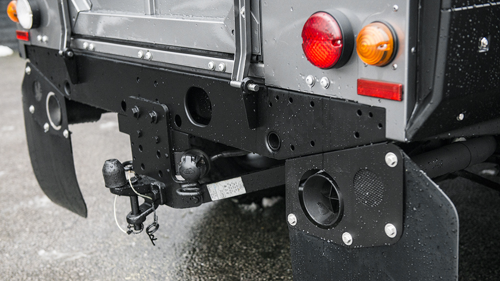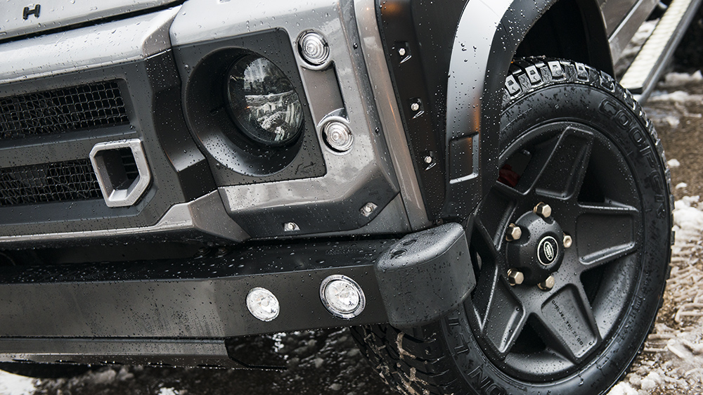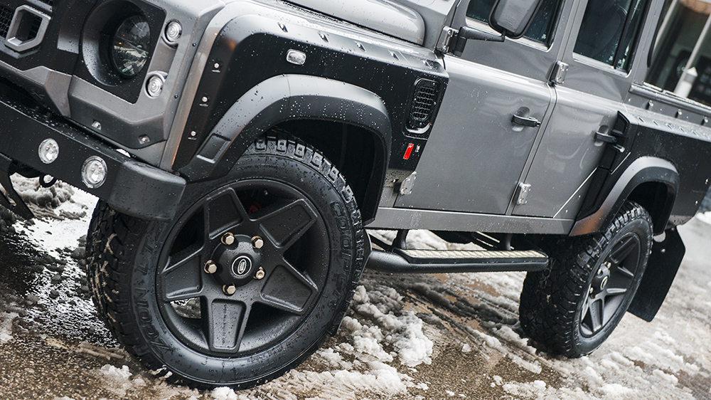 Even beneath the bodywork, the Defender XS 110 Double Cab Pick Up Chelsea Wide Track is tough. A new set of Volcanic Black Mondail wheels measuring 9.0 x 20 at the front and rear are wrapped in beefy 275/55/20 tires to grab at any kind of terrain. Behind the fat five-spoke, concave wheels sit Liquid Red brake calipers for a touch of contrast. A new set of toughened leather rear mud flaps and twin cross-hair exhaust round out the new upgrades.