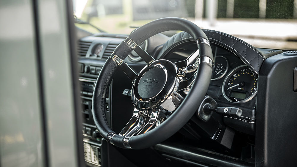 Elsewhere, drivers and passengers in the Chelsea Truck Company Land Rover Defender 110 Utility Wagon benefit from new door entry sill plates, reverse camera, Churchill time clock, new tachometer and speedometer, rear cabin access LED lights, machined and vented aluminum foot pedals, and a Kahn billet steering wheel for a real high-end quality.