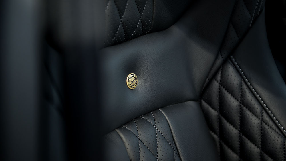 Sitting behind the dark-tinted privacy glass is a new set of front, middle, and rear GTB seats wearing quilted and perforated black leather. These are matched by the center glove box, passenger dashboard, grab handles, door cards, instrument binnacle, rear door card, roof headliner, and the visors for a soft, comfortable ride.