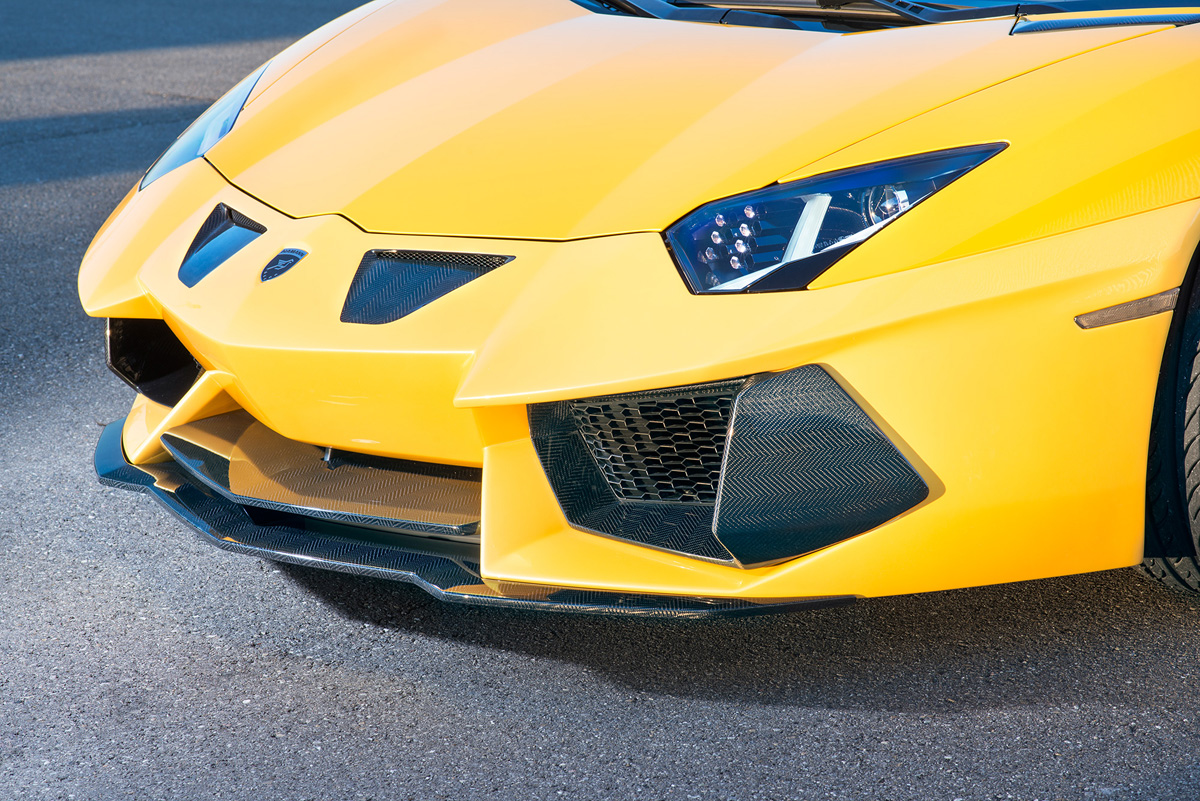 While many of the parts wear their clear-coated carbon fiber finish proudly, Hamann Motorsport gave their featured show car at the Geneva International Motor Show a new Giallo Orion paint that has a pearlescent yellow finish. The name begs those to reach for the stars, which is appropriate in more ways than one with the top down on the Lamborghini Aventador Roadster Limited.