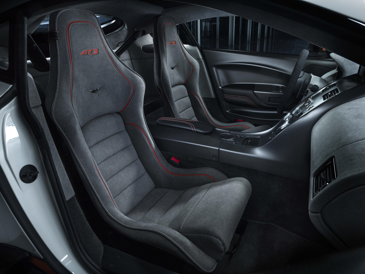 That same dedication to weight reduction and injecting the brand’s motorsport DNA is evident inside the Aston Martin Vantage GT3. The entire center stack is made from carbon fiber and features touch-sensitive controls. Lightweight, race-inspired sport seats with generous lateral support hold driver and passenger in place during high lateral-G forces. Soft, lightweight alcantara adorns much of the cockpit while new bespoke features from the Q by Aston Martin personalization service adds a touch of class.