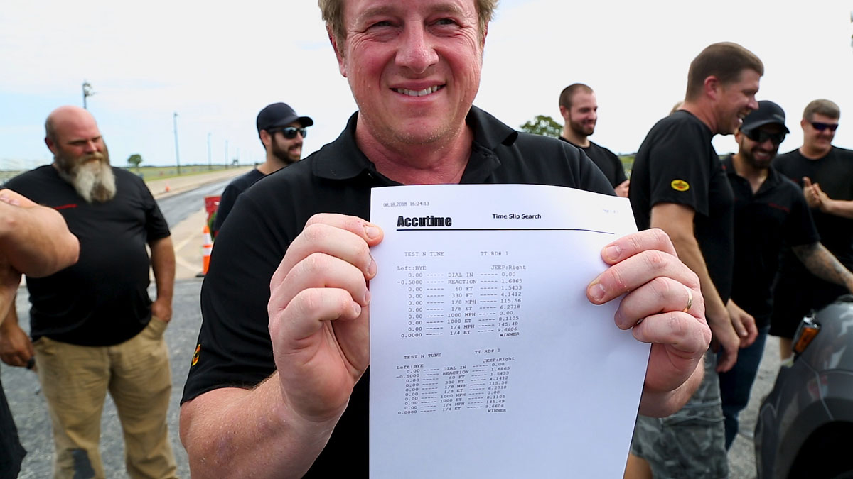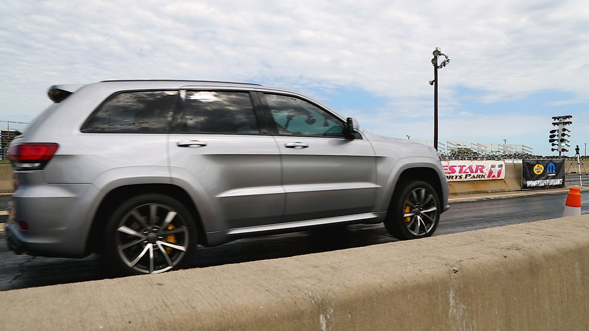 Prior to the run, the Hennessey Performance HPE1200 Jeep Grand Cherokee SRT Trackhawk was outfitted with new 275/40-20 Nitto 555R drag radial tires. It was also given a special software upgrade that allowed the Trackhawk to convert to rear-wheel drive for doing a burnout and warming up the tires prior to the run. After flipping a switch, the SUV returned to all-wheel drive for the run.