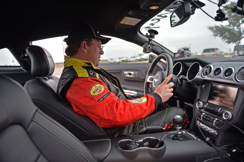 After making the 240-mile one-way trip in the HPE700 Ford Mustang, the duo spent the night and waited until the morning dew dried the next day to start testing. After a warmup lap on the oval test track with two 1.1-mile straights, John went for speed.