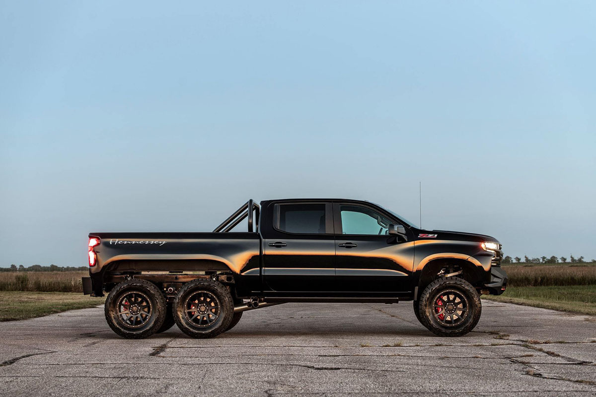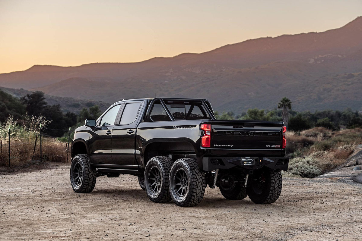 After Mercedes-Benz unveiled their G 63 AMG 6×6, the world of high-end off-roading was changed forever. This all-terrain halo SUV was the ultimate in go-anywhere performance. So, the team at Hennessey created the VelociRaptor 6X6 based on the Ford F-150 Raptor. Now, they’re turning things up to 11 again with the new fourth-gen 2019/2020 Chevrolet Silverado in the form of the Hennessey Goliath 6X6.