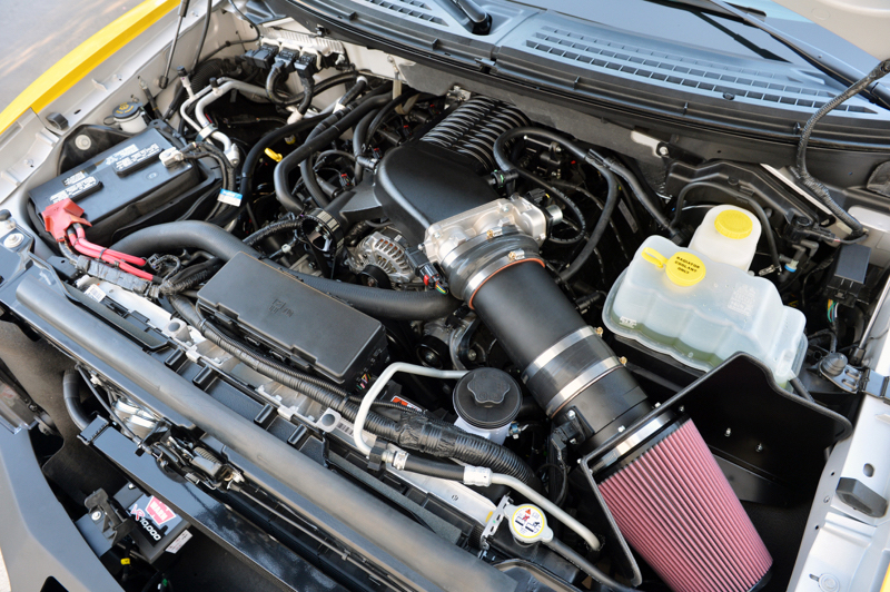 The mighty 5.0-liter V-8 engine gains a new 2.9-liter supercharger system that includes a new air-to-water intercooler, high-flow air induction, and fuel injector upgrades. After the installation, a new HPE engine management software tune is programmed, followed by dyno and road testing. Then, monster truck is ready to eat pavement, dirt, or whatever else dares to get in its way thanks to a whopping 650 bhp at 5,700 RPM.