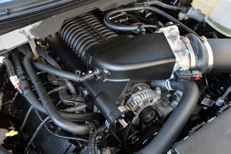 The mighty 5.0-liter V-8 engine gains a new 2.9-liter supercharger system that includes a new air-to-water intercooler, high-flow air induction, and fuel injector upgrades. After the installation, a new HPE engine management software tune is programmed, followed by dyno and road testing. Then, monster truck is ready to eat pavement, dirt, or whatever else dares to get in its way thanks to a whopping 650 bhp at 5,700 RPM.