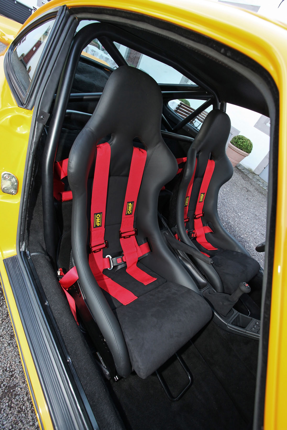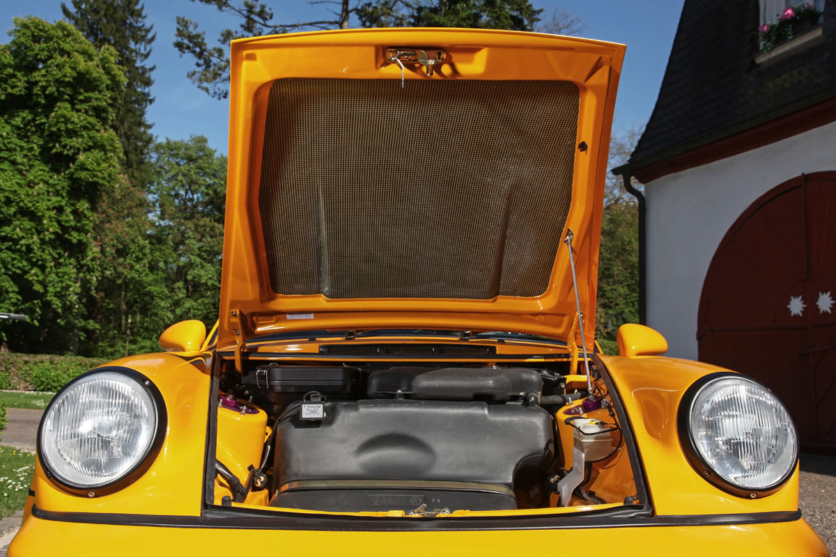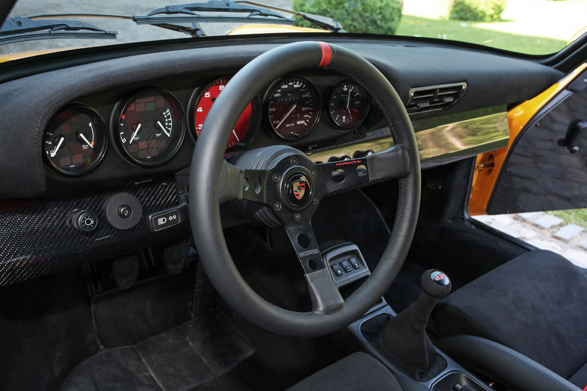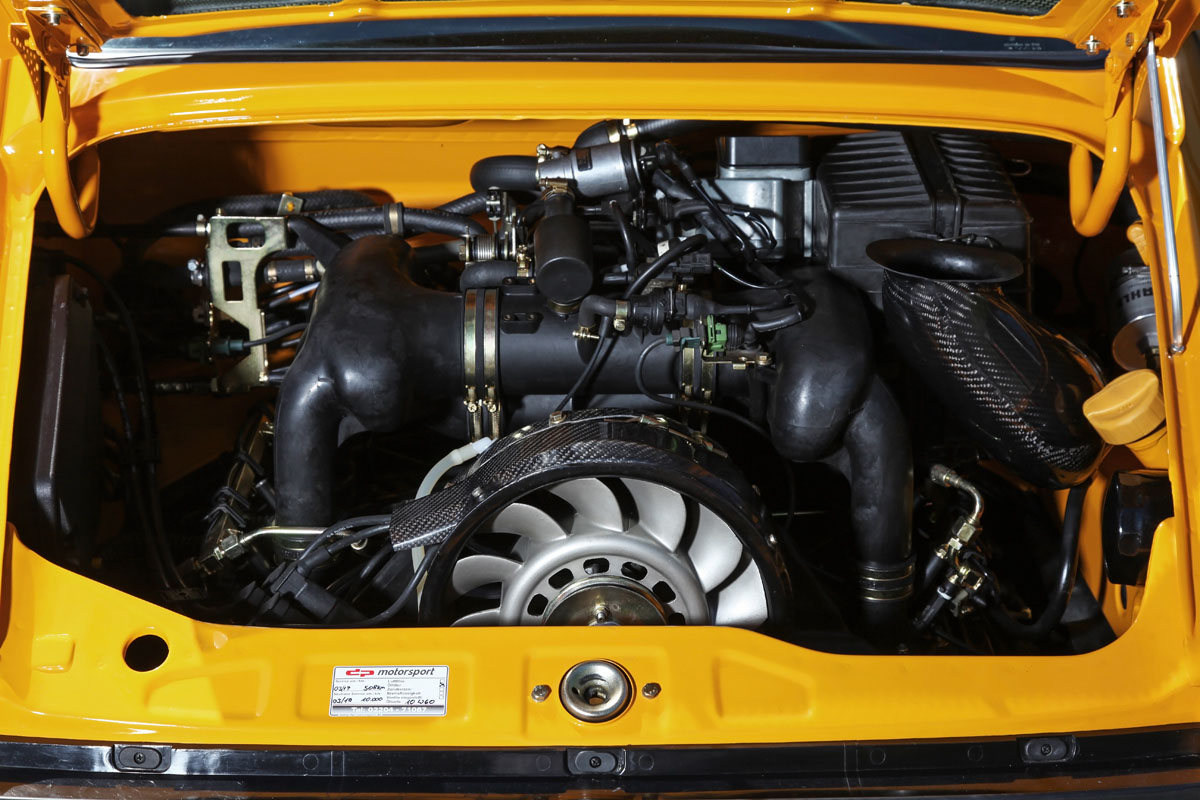 It all started with the bare shell of the 964 911. DP Motorsport used lightweight carbon fiber body work and gave it the Turbo widebody look. A new DP RS front spoiler lip and SC RS trunk lid add a bit of visual athleticism while alu-hood front hood supports and glass/plexiglass windows cut down on weight. The entire sports car was then covered in Porsche color-114 – the famous ‘Signal Yellow’.
