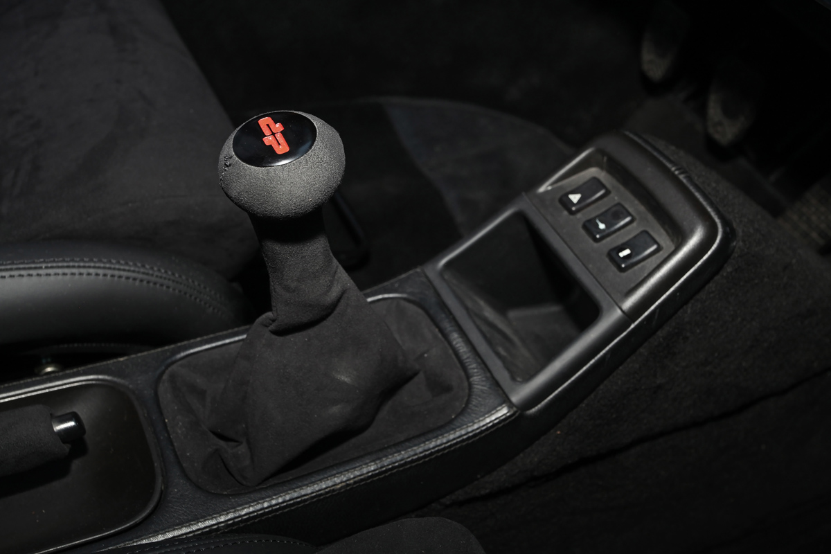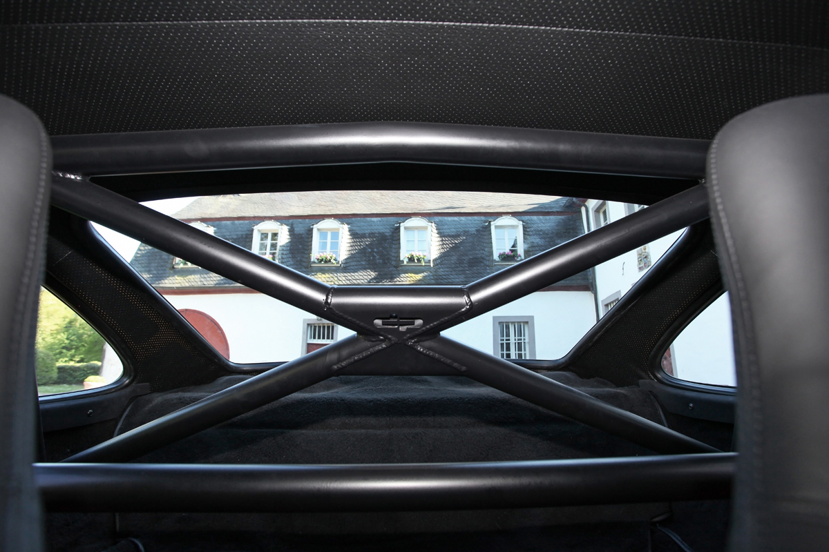 Inside, the dedication to cutting weight and focusing on driving is clearly on display. DP Motorsport installed carbon fiber Pole-Position Recaro seats with four-point OMP harnesses. A bolted DP Motorsport rollover bar was also installed to keep driver and passenger safe in the event of an accident. Facing the driver is a 350 mm Momo sports steering wheel. Carbon fiber also makes up the dashboard and knee rails. Also keeping weight to a minimum is a lightweight fresh air fan, electronically-heated windscreen, motorsport battery in an aluminum housing, and lightweight velour carpet. A mix of leather and Alcantara add a bit of comfort and style for this focused sports car.