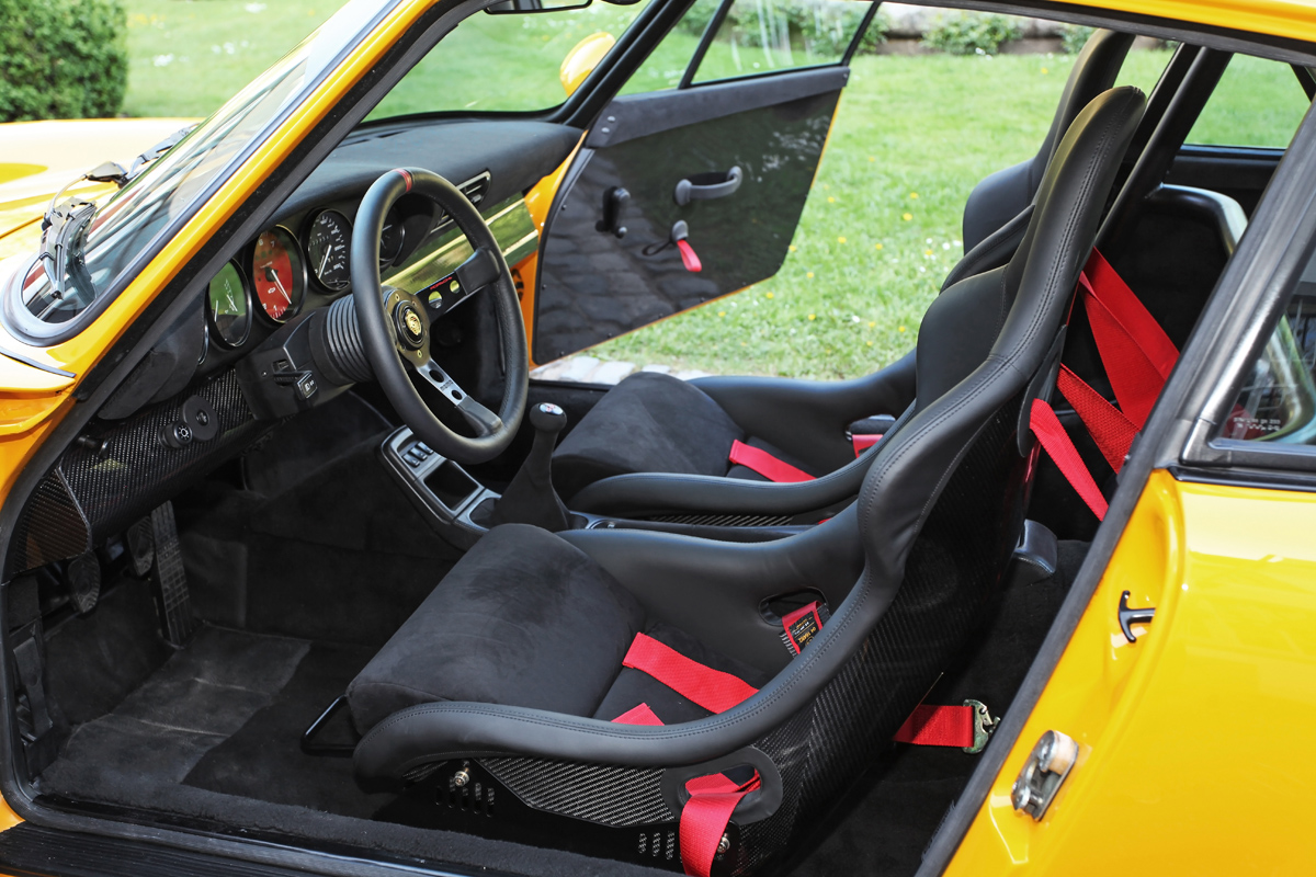 It all started with the bare shell of the 964 911. DP Motorsport used lightweight carbon fiber body work and gave it the Turbo widebody look. A new DP RS front spoiler lip and SC RS trunk lid add a bit of visual athleticism while alu-hood front hood supports and glass/plexiglass windows cut down on weight. The entire sports car was then covered in Porsche color-114 – the famous ‘Signal Yellow’.